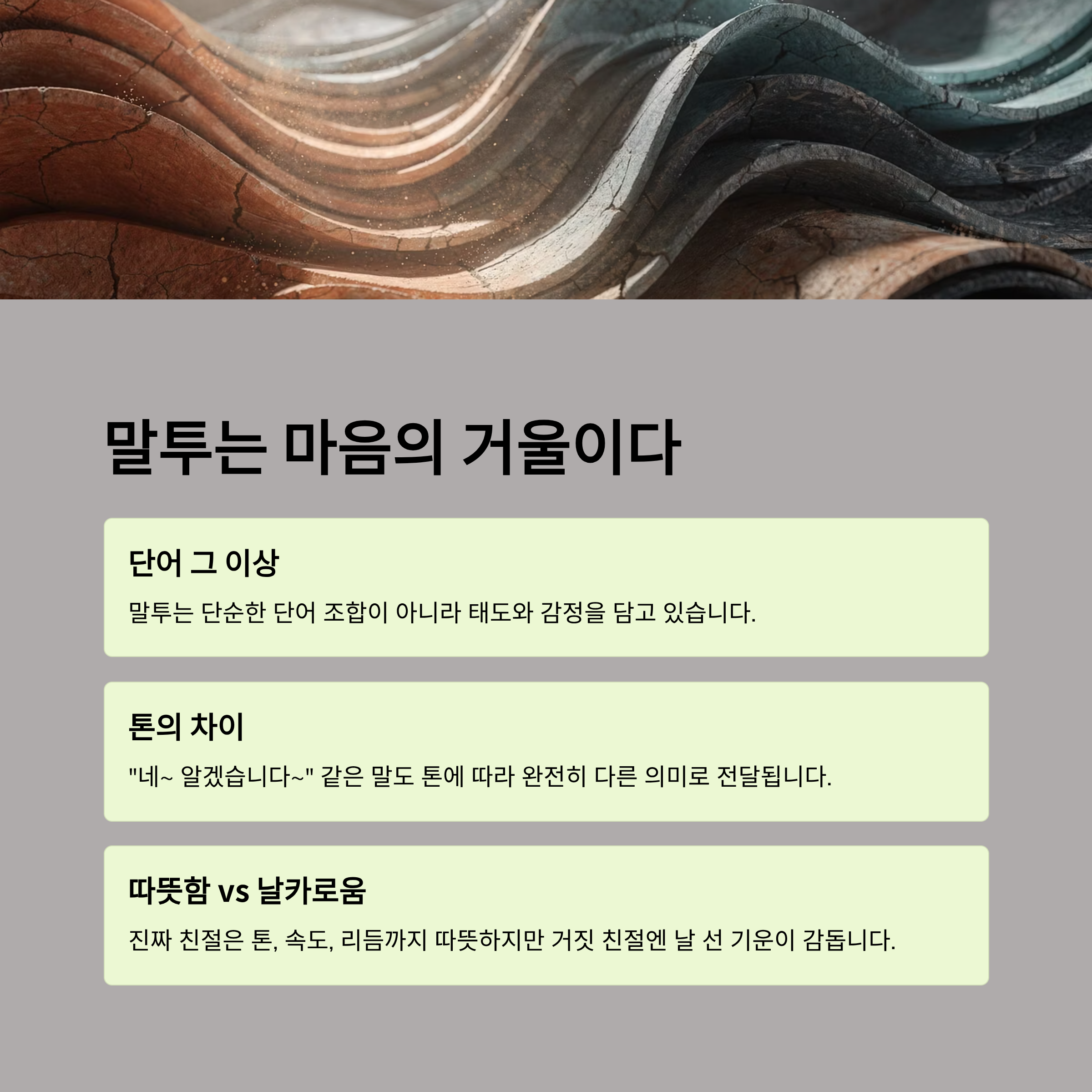 그건 말투가 단순히 단어의 조합이 아니라, 말하는 이의 태도와 감정을 담고 있기 때문이에요.