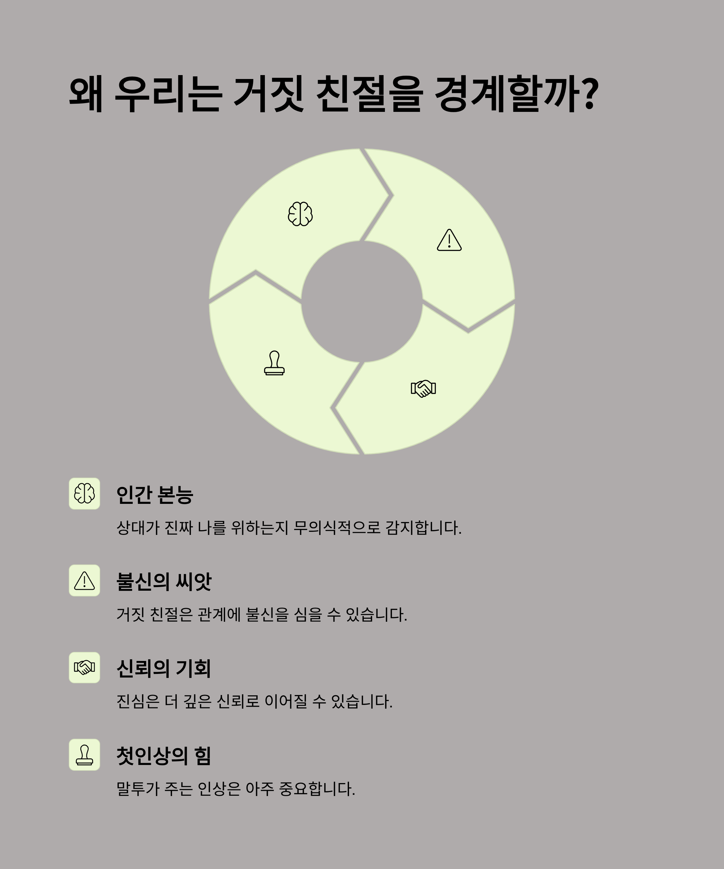 사람 사이의 말투에는 그 사람의 속마음이 묻어납니다. 아무리 예의를 갖춘 말이라도, 진심이 빠진다면 듣는 사람은 오히려 불쾌감을 느낄 수 있어요. 특히 '거짓 친절'은 그 얇은 껍질 너머의 감정이 그대로 들켜버립니다. 이번 글에서는 말투로 드러나는 거짓 친절의 특징과, 그 미묘한 차이를 어떻게 알아차릴 수 있는지에 대해 이야기해보겠습니다.