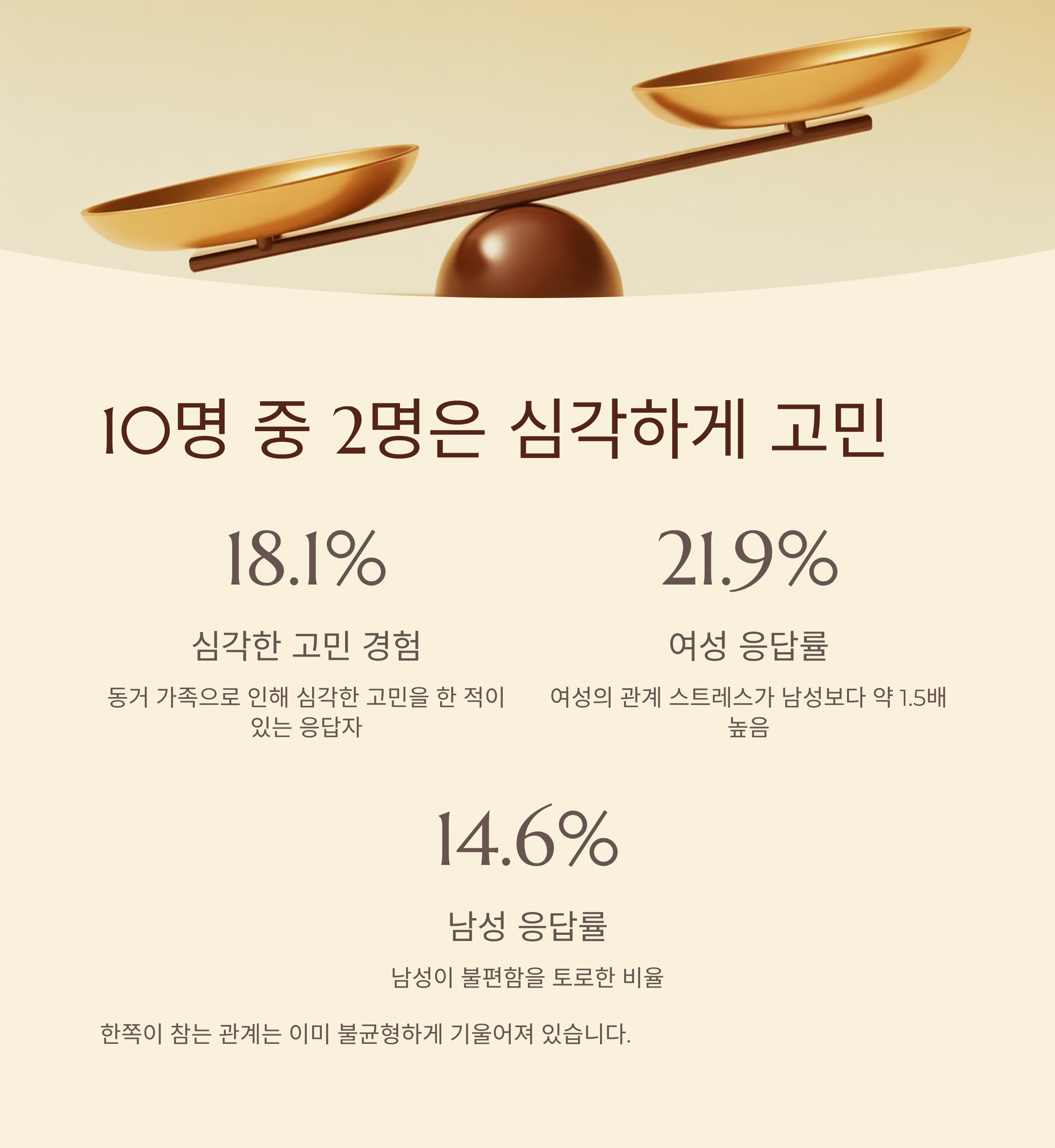 2025년 서울가족보고서에 따르면, ‘동거 가족으로 인해 심각한 고민을 한 적이 있다’는 응답이 전체의 18.1%에 달했습니다. 여성의 21.9%, 남성의 14.6%가 불편함을 토로했는데요, 이는 여성의 관계 스트레스가 남성보다 약 1.5배 높다는 점을 시사합니다. 즉, 한쪽이 참는 관계는 이미 불균형하게 기울어져 있는 셈입니다.