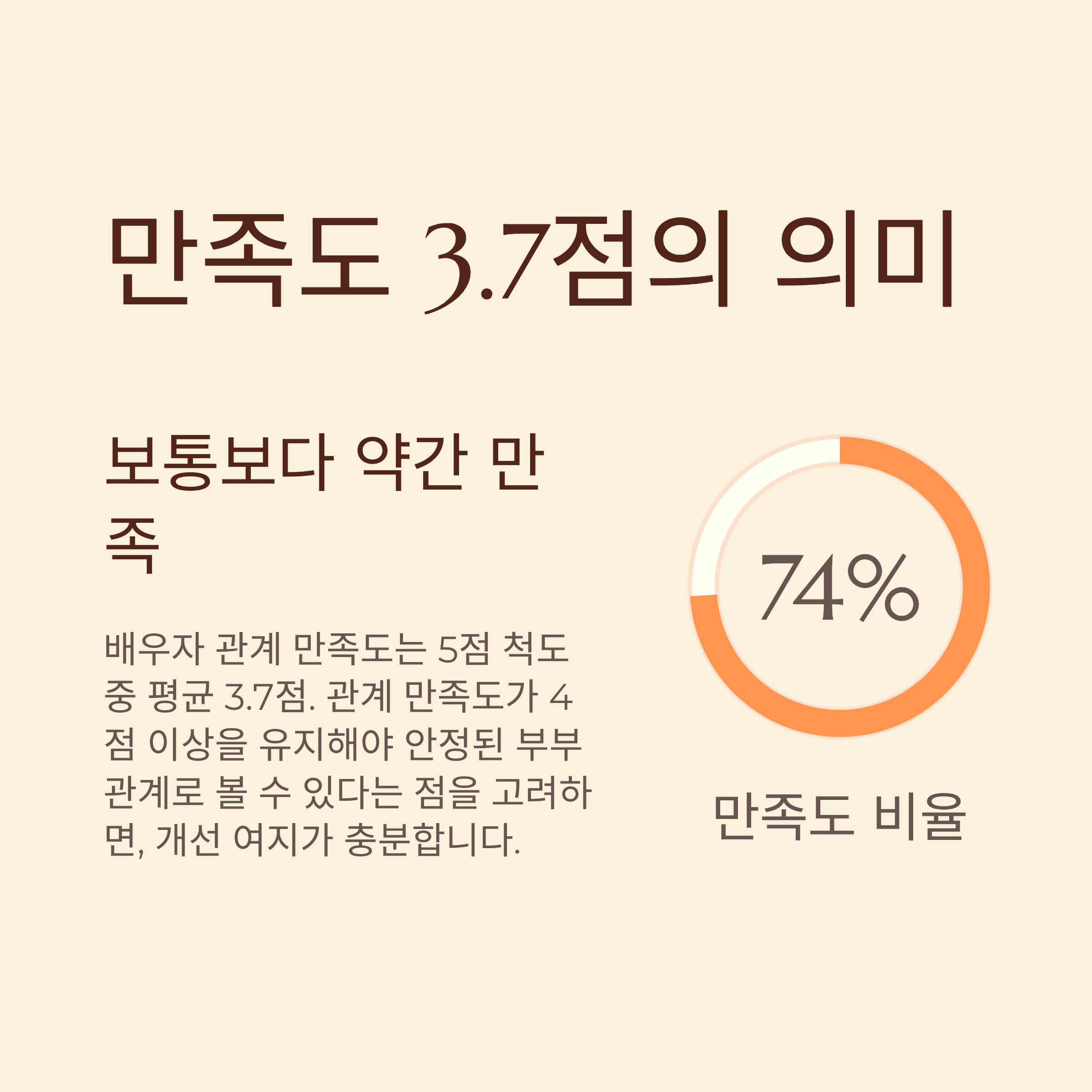 배우자 관계 만족도는 5점 척도 중 평균 3.7점으로 나타났습니다. 수치만 보면 무난해 보이지만, 이는 곧 ‘보통보다 약간 만족’ 수준입니다. 관계 만족도가 4점 이상을 유지해야 안정된 부부 관계로 볼 수 있다는 점을 고려하면, 아직 많은 부부가 관계 내 불균형과 피로를 경험하고 있는 것으로 해석됩니다.