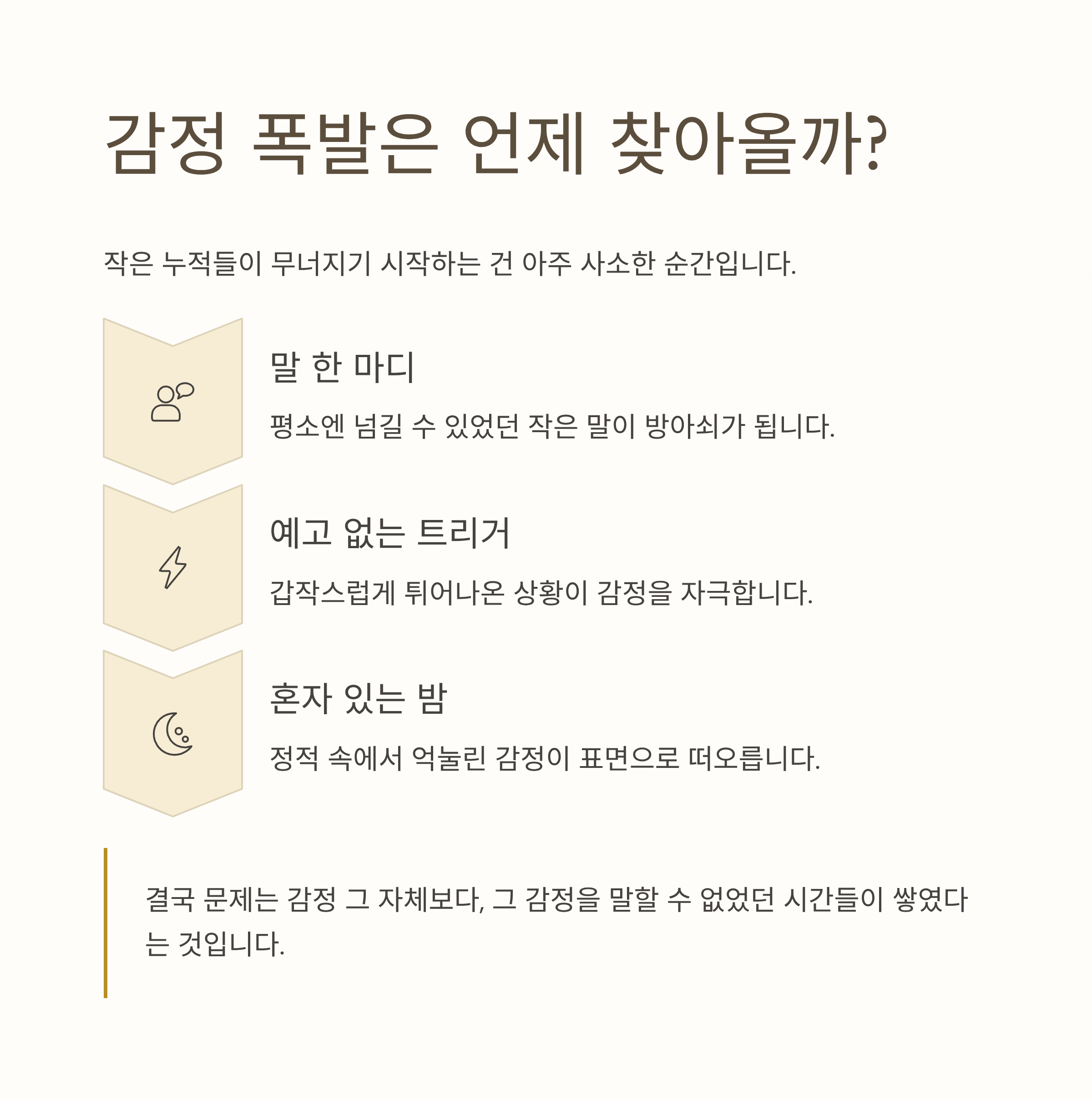 평소엔 넘길 수 있었던 말 한 마디, 예고 없이 튀어나온 트리거, 혹은 혼자 있는 밤의 정적이 방아쇠가 됩니다.