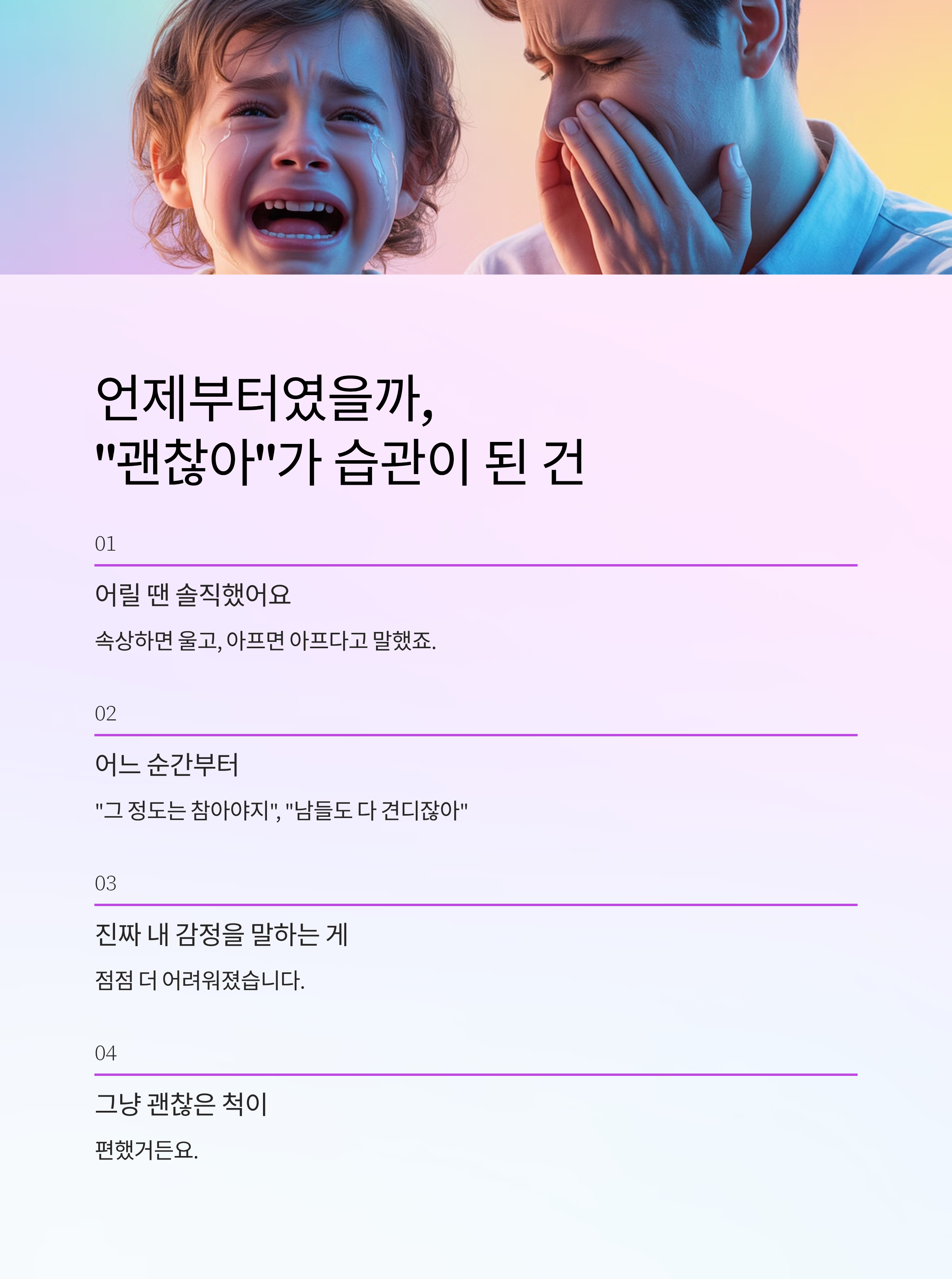 마음은 괜찮지 않은데 입에서는 습관처럼 튀어나오고, 결국 감정은 눌리고 또 눌려서 터질 구멍을 찾게 됩니다.
