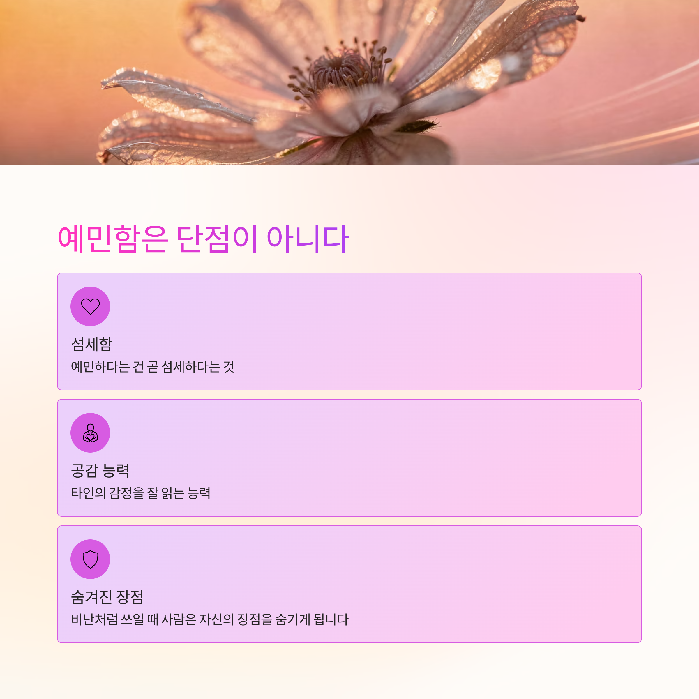 예민하다는 건 곧 섬세하다는 것이고, 타인의 감정을 잘 읽는 능력이 있다는 뜻이기도 합니다.