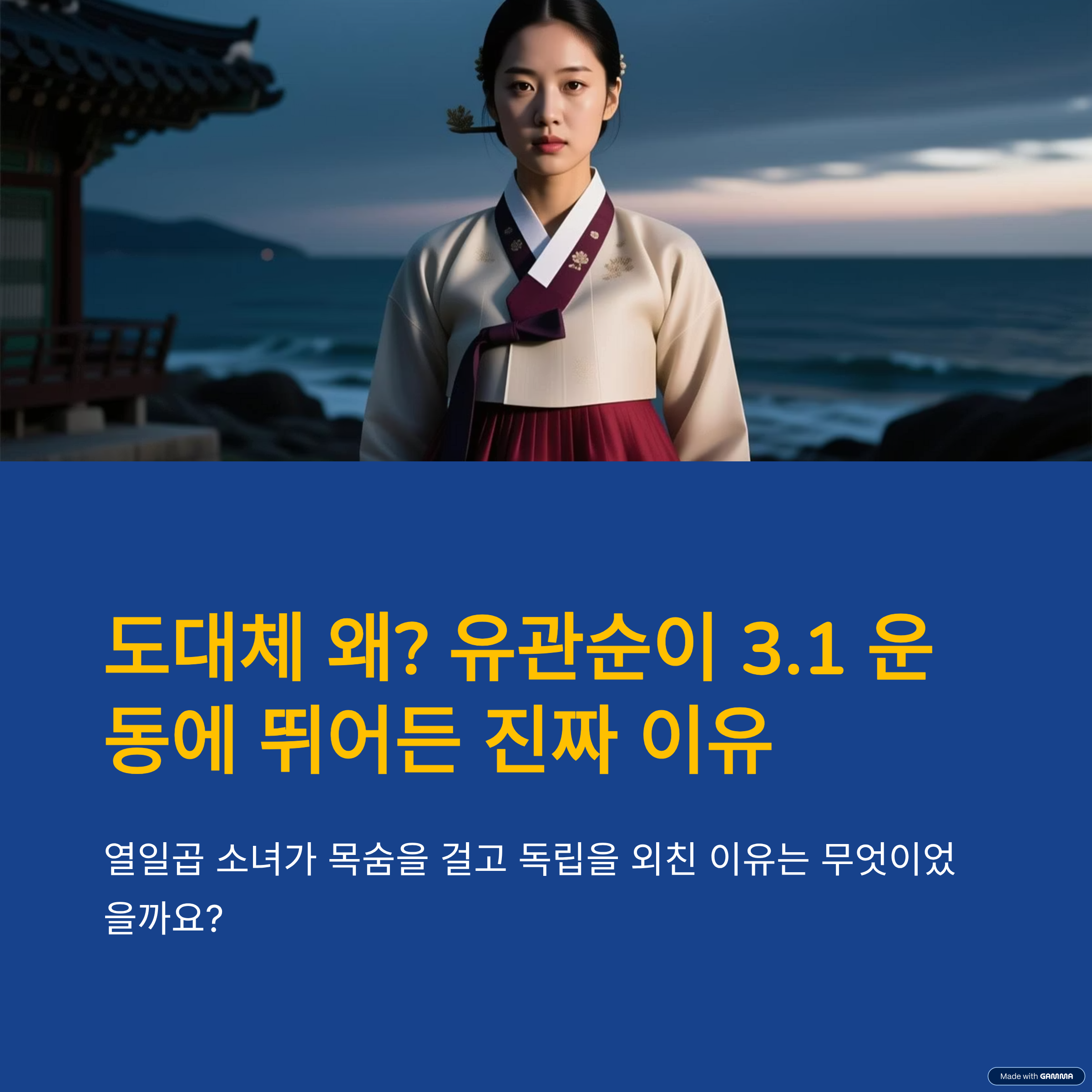 유관순은 단순한 독립운동가가 아니었습니다. 열일곱의 소녀가 거리로 나선 이유는 단지 민족 감정 때문만은 아니었죠. 그녀의 선택 뒤엔 교육, 시대적 분위기, 그리고 가족의 영향까지 복합적인 배경이 자리하고 있었습니다. 이 글에서는 우리가 미처 몰랐던 유관순의 내면과, 그녀가 왜 그토록 뜨겁게 조국을 외쳤는지를 깊이 있게 들여다봅니다.