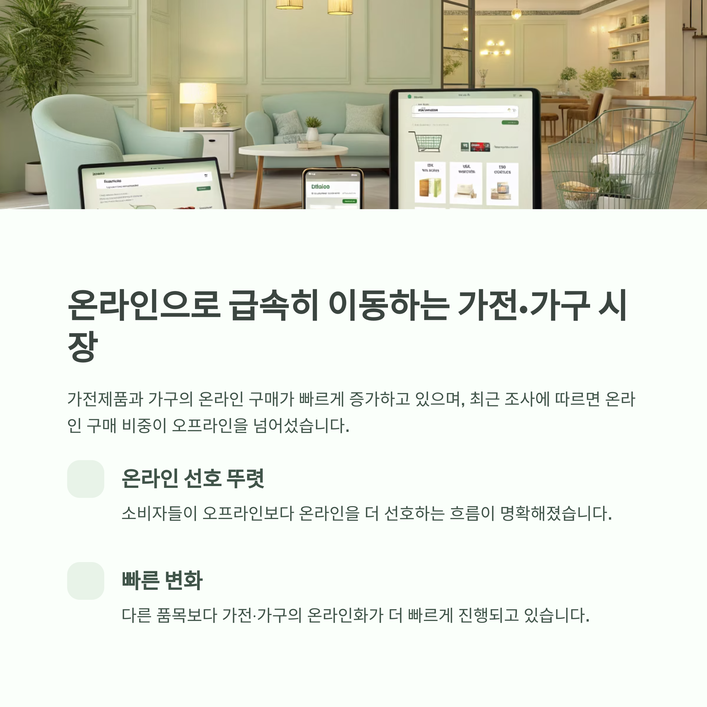 가전·가구 제품군은 그 중심에서 가장 빠른 온라인 전환을 보여주고 있습니다.