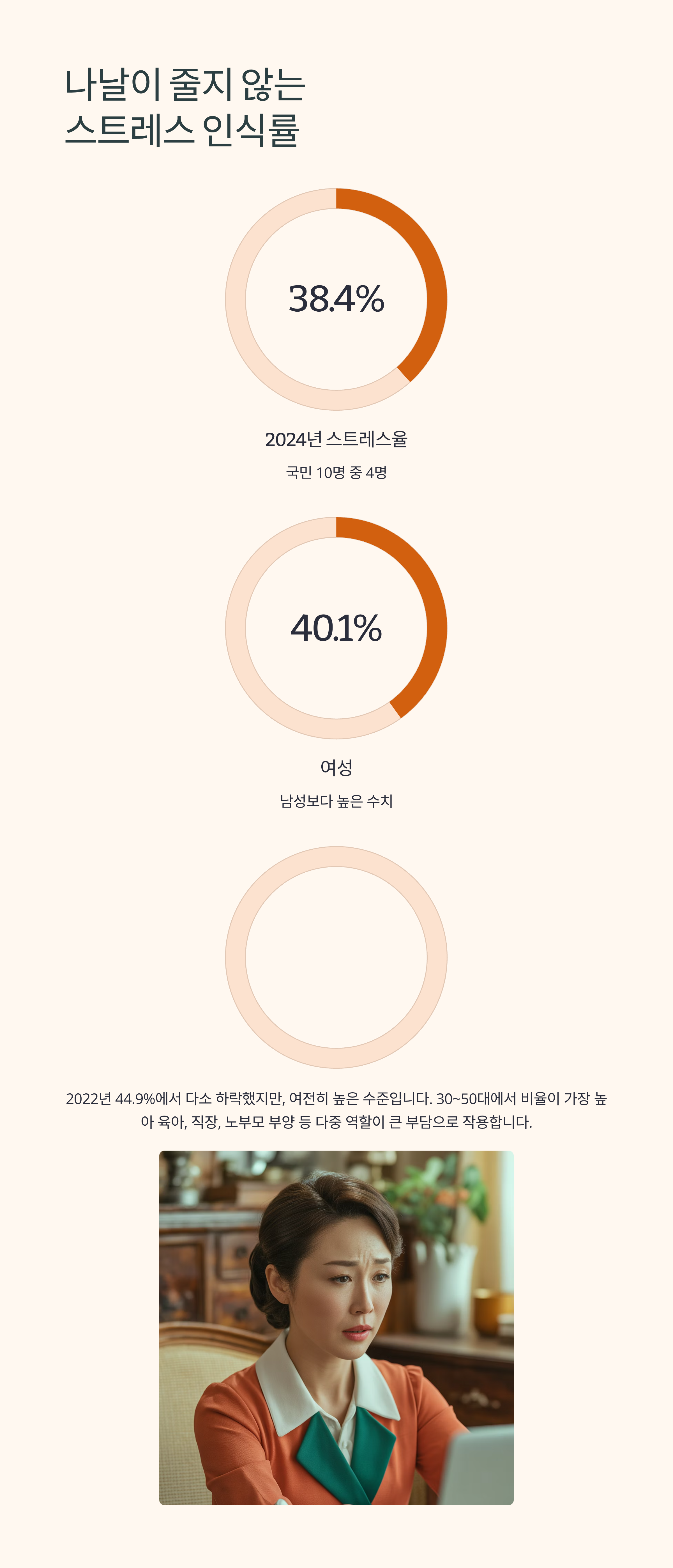 특히 여성(40.1%)이 남성(36.7%)보다 더 높은 스트레스 인식률을 보였고, 30~50대에서 그 비율이 가장 높아 육아와 직장, 노부모 부양 등의 다중 역할이 큰 부담으로 작용하고 있다는 걸 암시합니다.