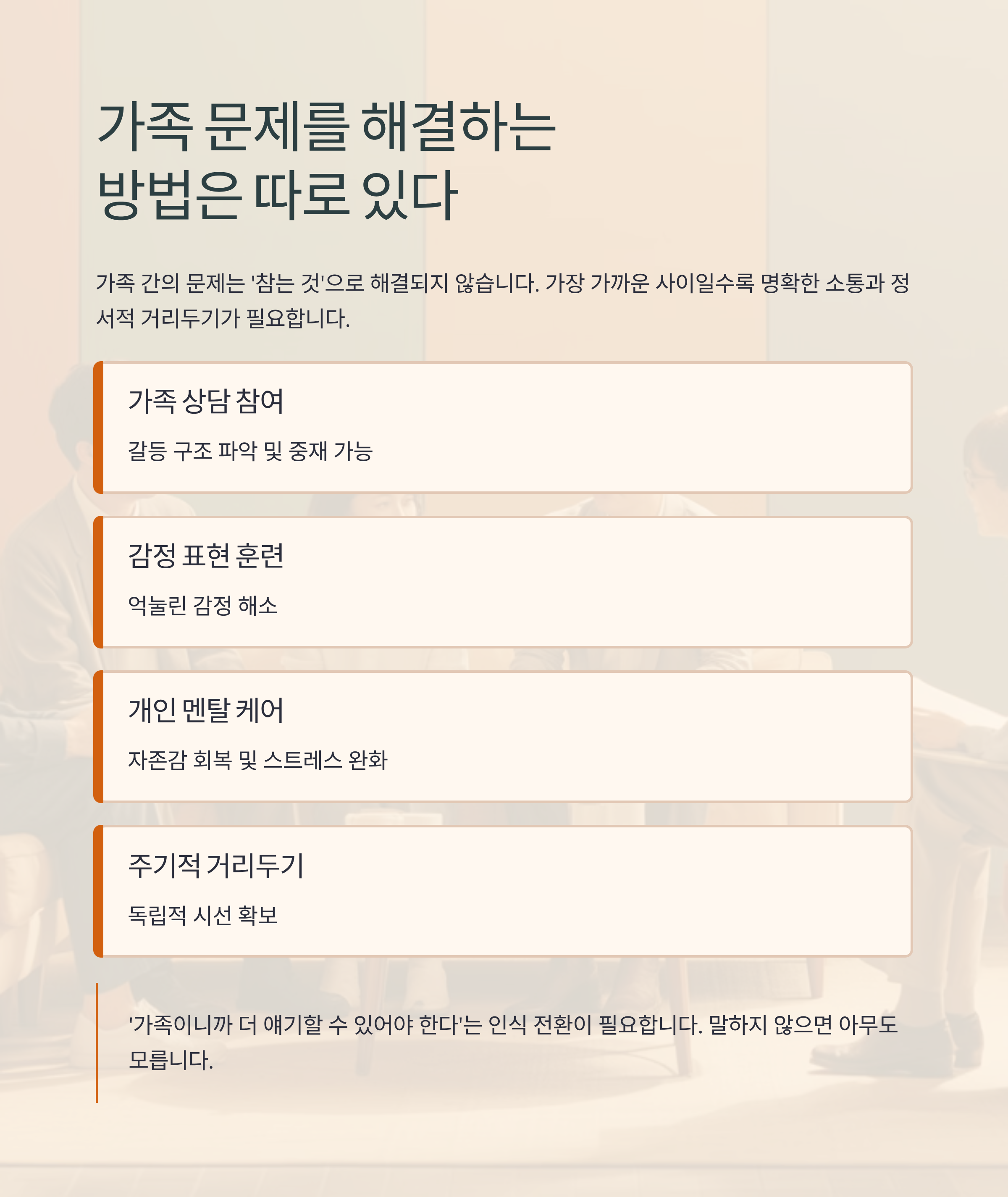가족 간의 문제는 ‘참는 것’으로 해결되지 않습니다. 가장 가까운 사이일수록 명확한 소통과 정서적 거리두기가 필요합니다.