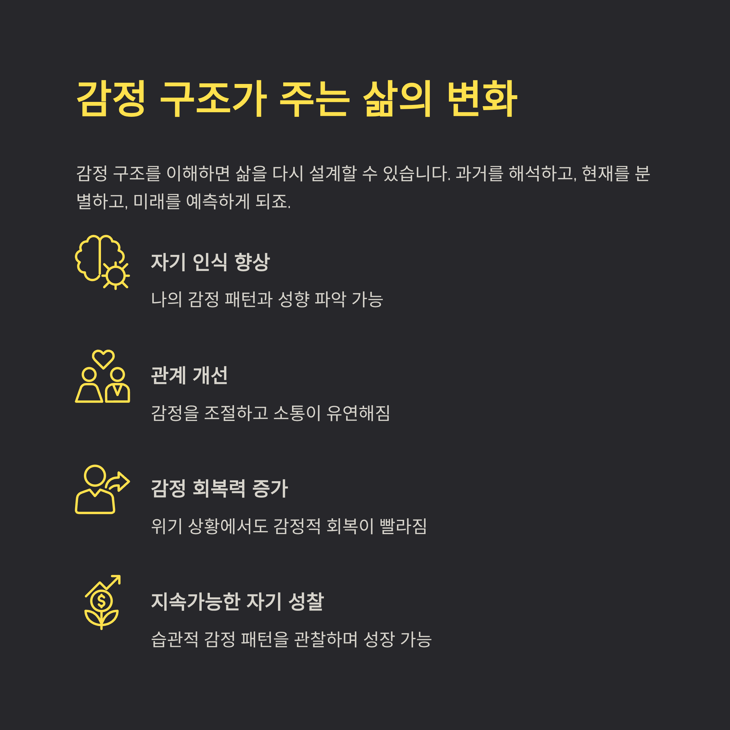 과거를 해석하고, 현재를 분별하고, 미래를 예측할 수 있게 되죠. 이 모든 변화는 감정을 구조적으로 바라보는 것에서 시작됩니다.