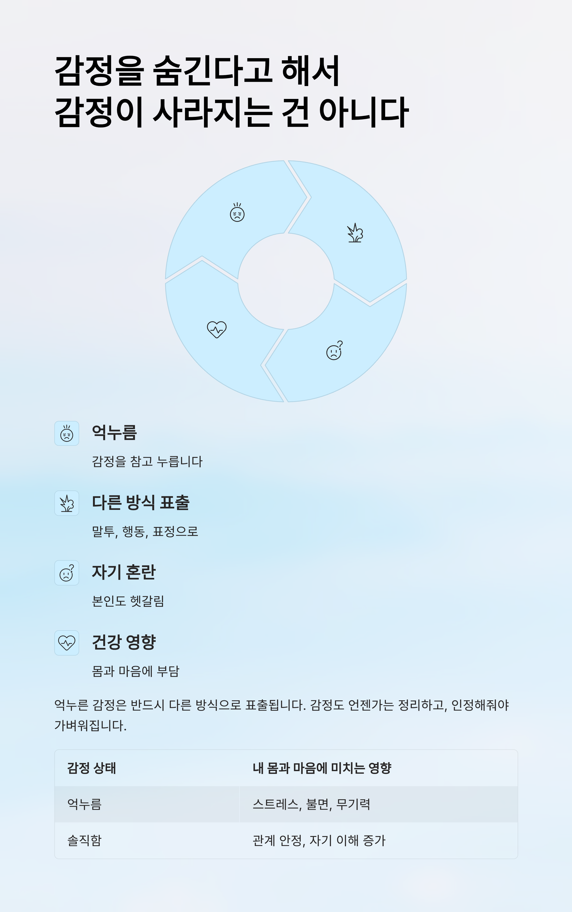 속마음을 누르고 참는다고 해서 감정이 사라지지는 않아요.