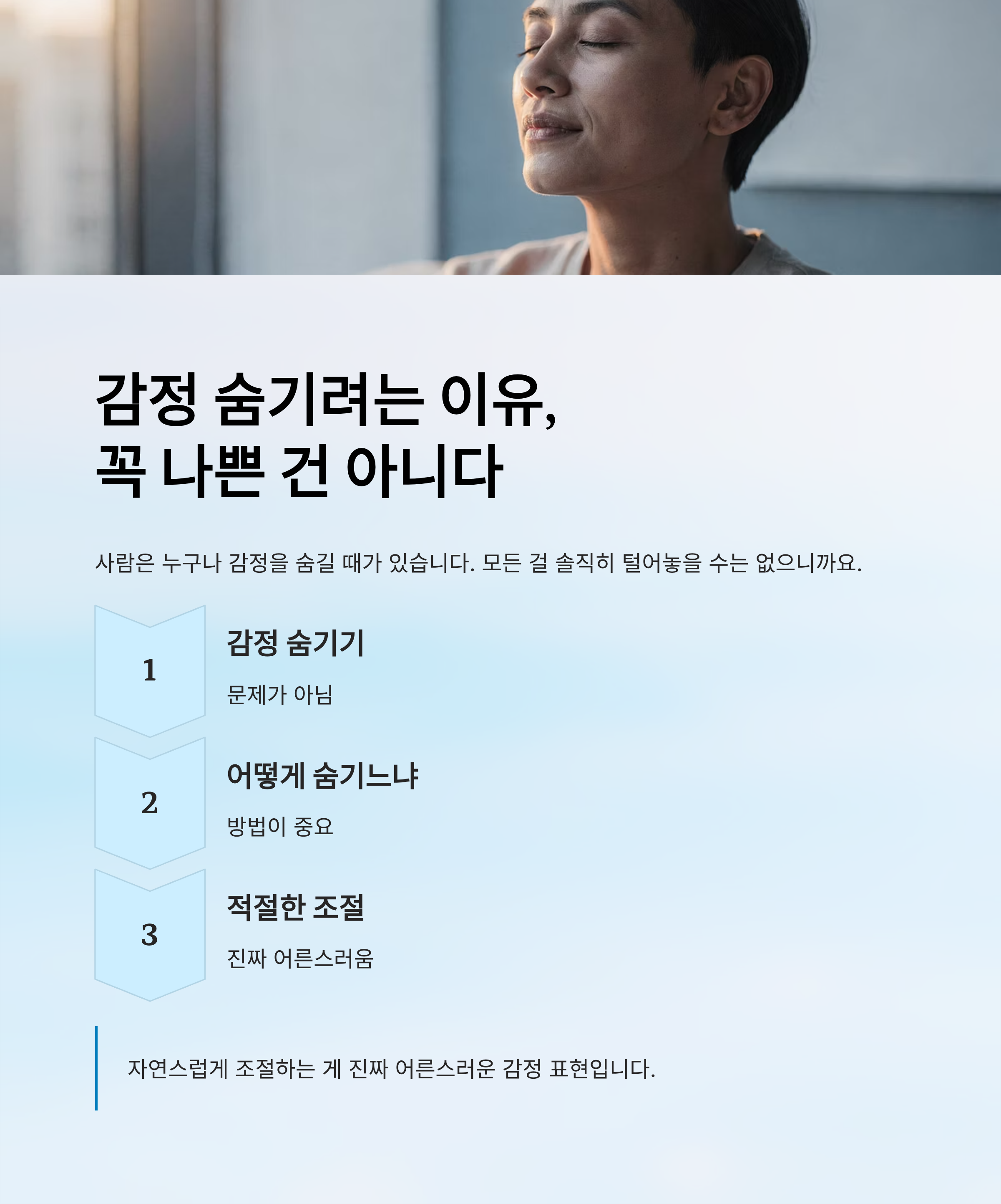 중요한 건, 감정을 숨기는 게 문제가 아니라 ‘어떻게 숨기느냐’입니다. 진심을 애써 감추는 게 아니라, 적절한 선에서 조절하는 거죠.