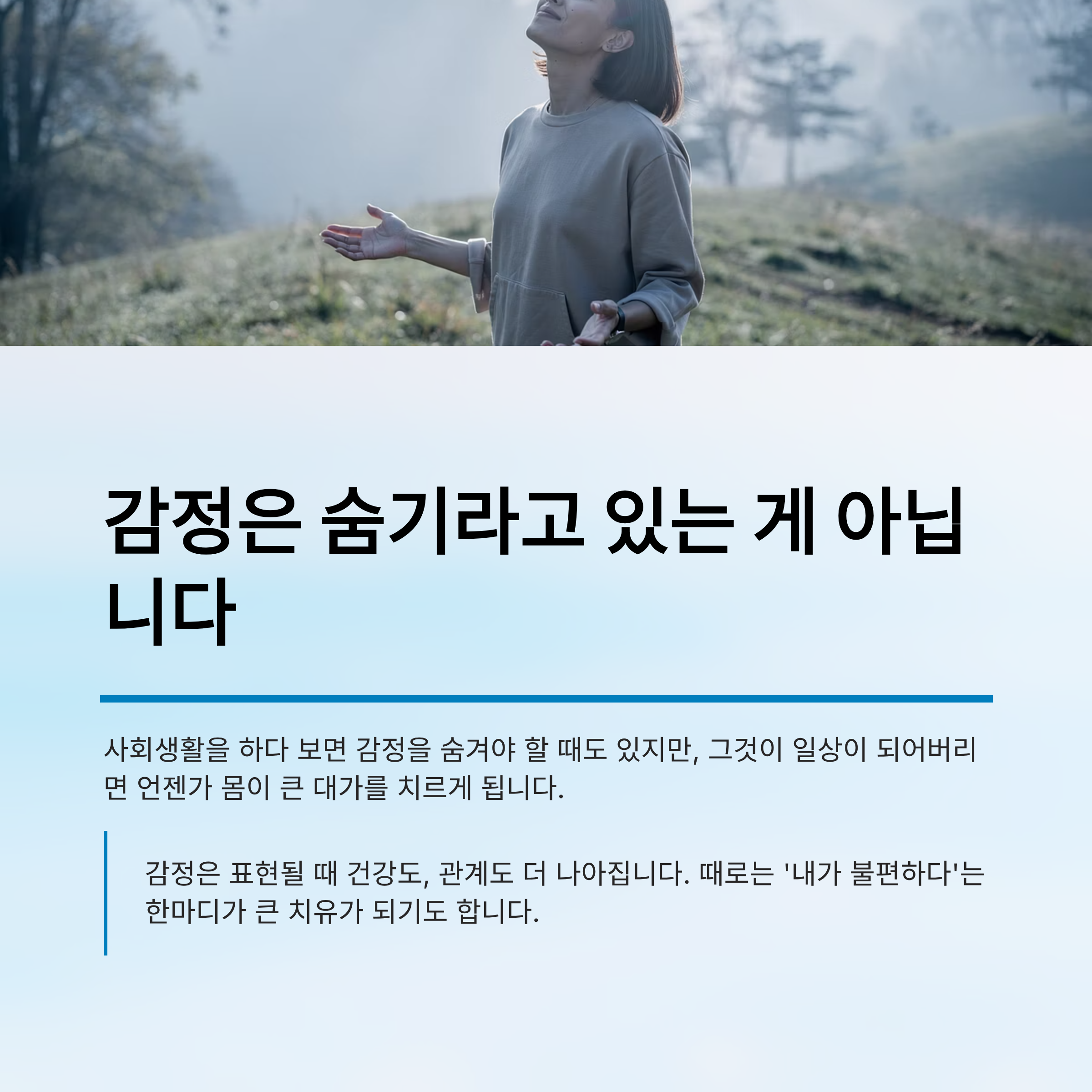 억지로 밝게 웃거나, 아무렇지 않은 척하기보다는 솔직하게 말하는 연습이 훨씬 건강에 이롭습니다.