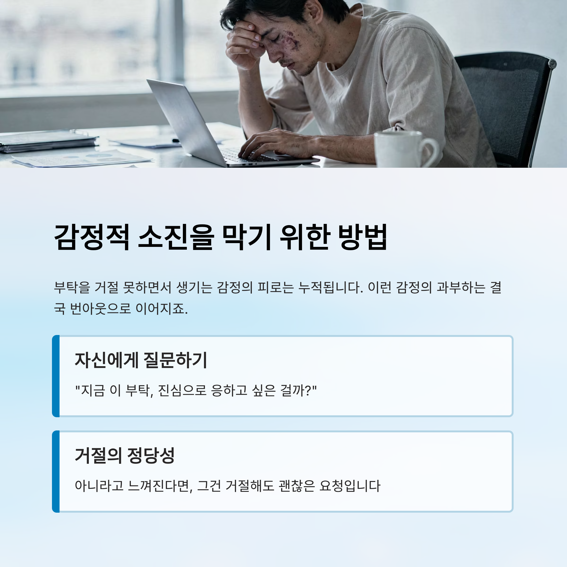 부탁을 거절 못하면서 생기는 감정의 피로는 누적됩니다.
