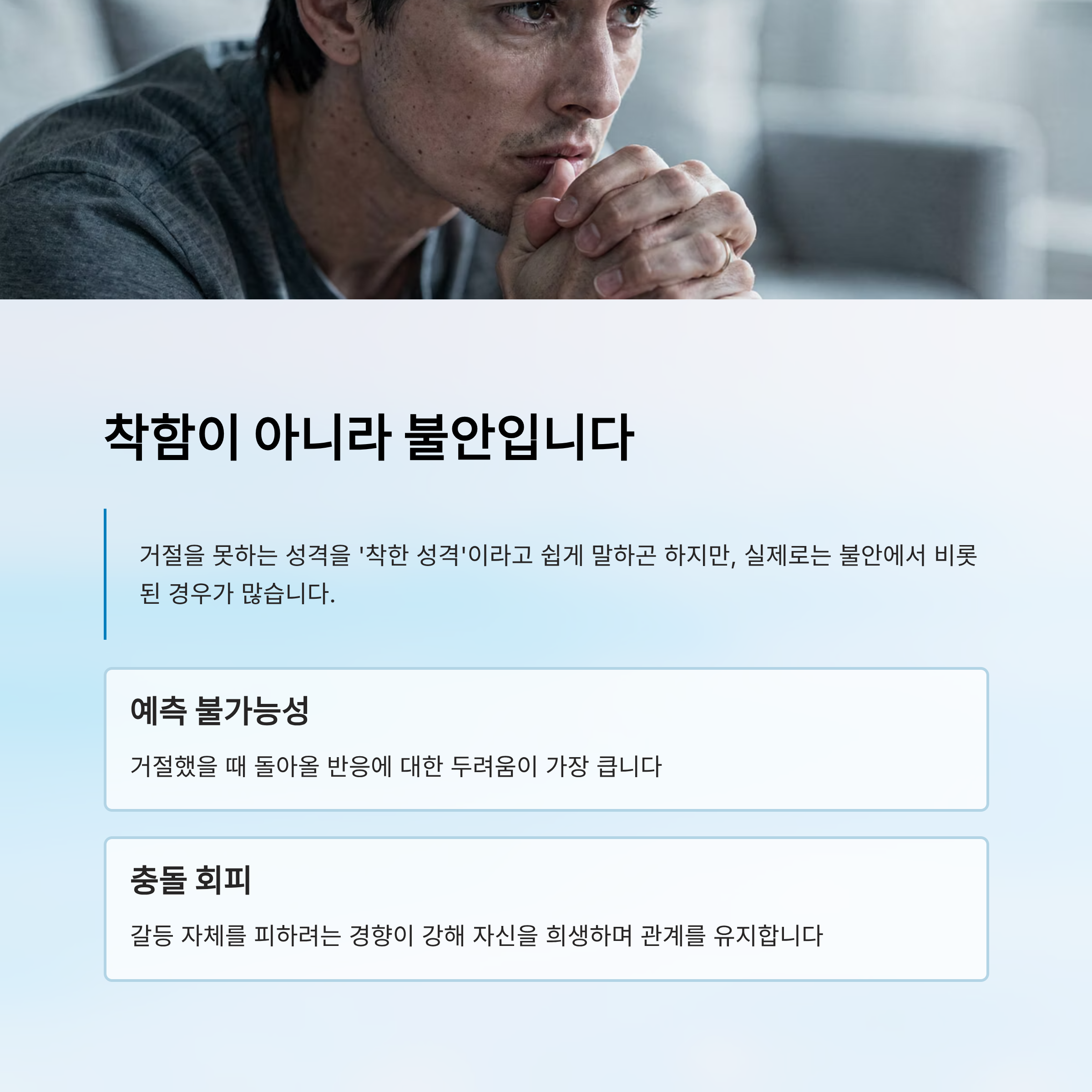 거절을 못하는 성격을 '착한 성격'이라고 쉽게 말하곤 하지만, 실제로는 불안에서 비롯된 경우가 많습니다.