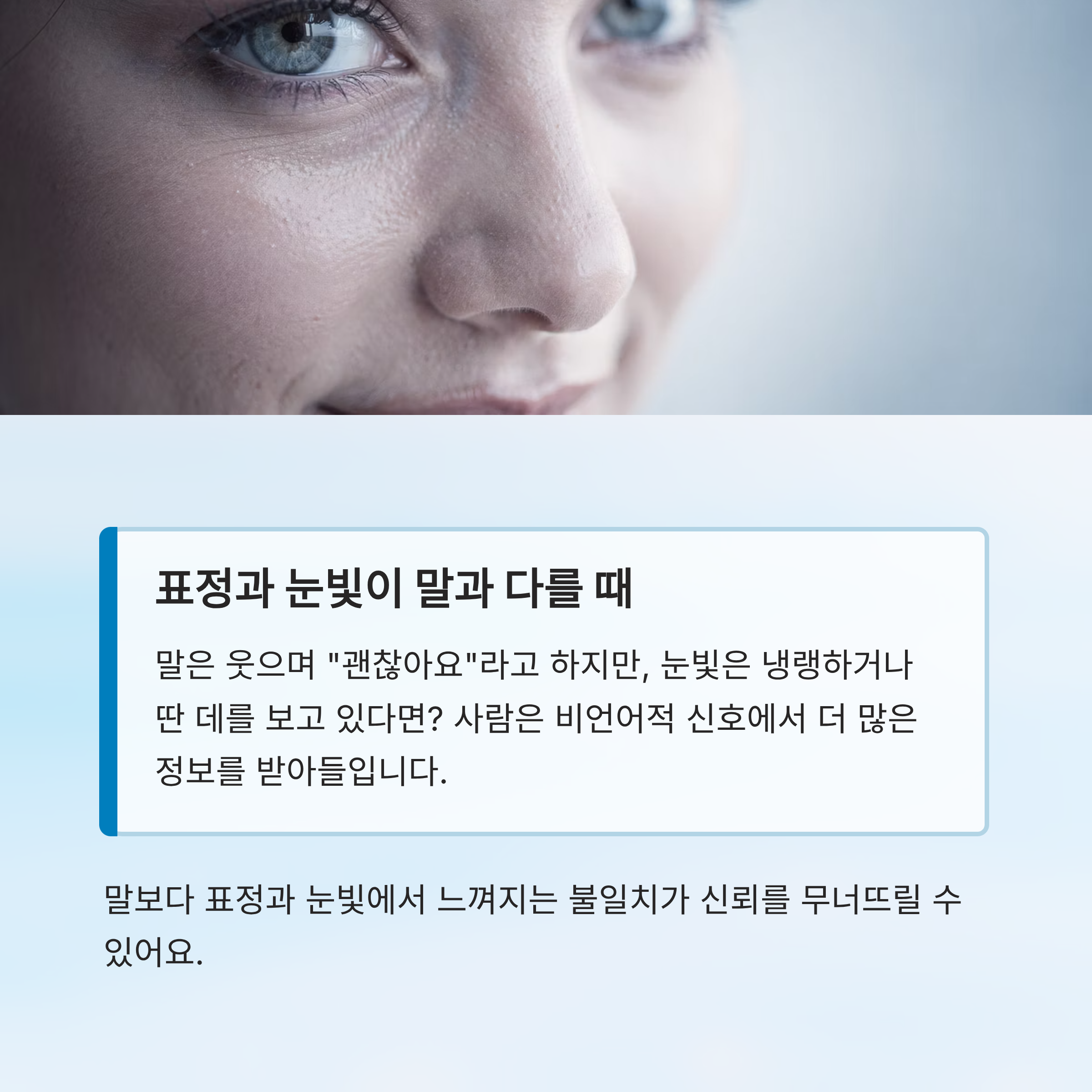 말보다 표정과 눈빛에서 느껴지는 불일치가 신뢰를 무너뜨릴 수 있어요.