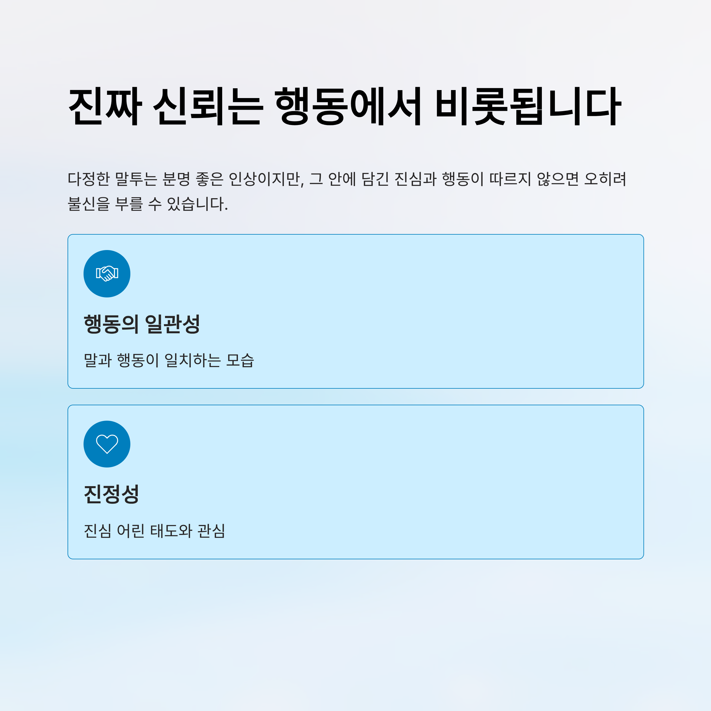 진짜 신뢰는 말투보다 '행동의 일관성'과 '진정성'에서 비롯된다는 걸 잊지 마세요.
