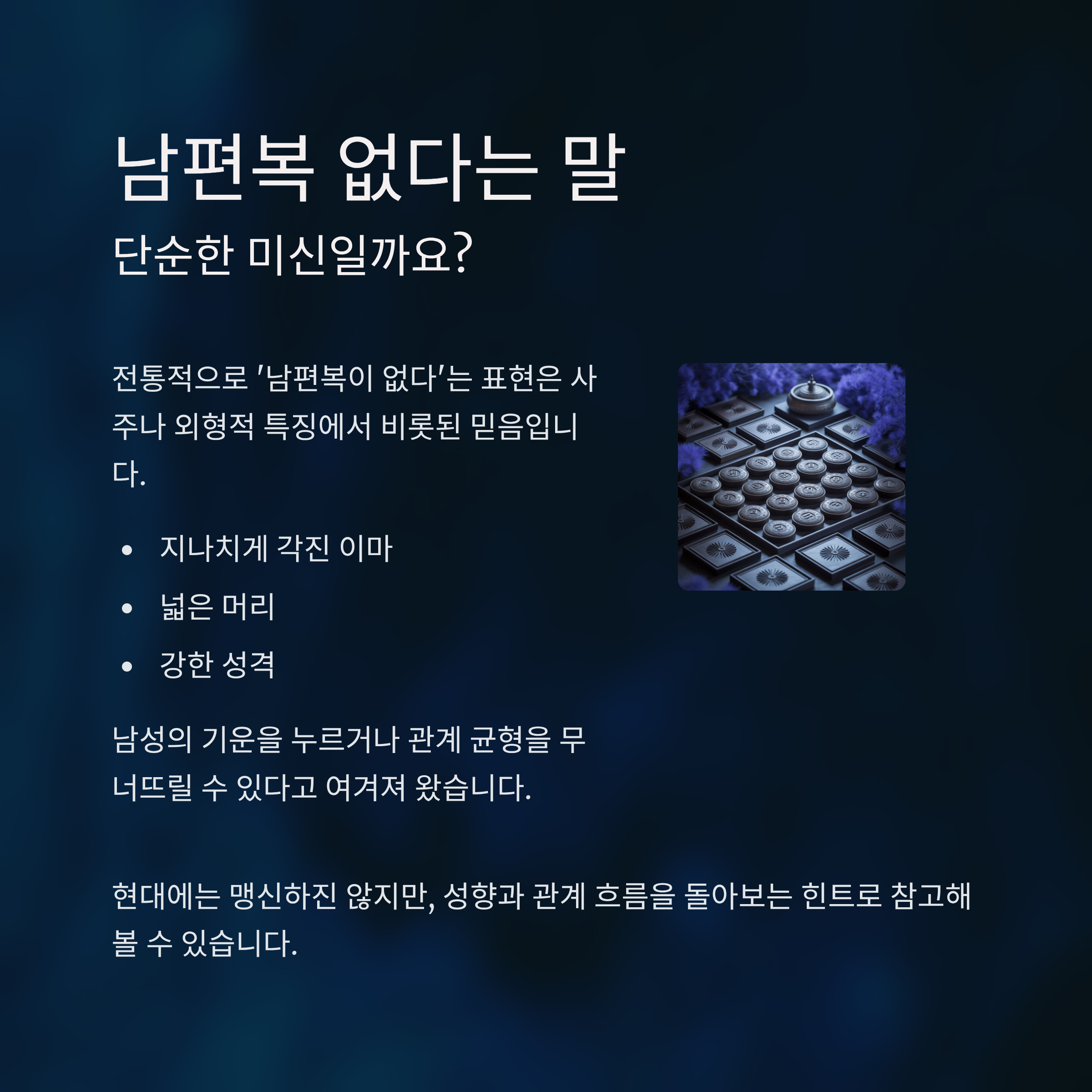 결혼은 감정이 달아오를 때보다, 일상이 시작될 때 더 많은 것들이 드러납니다. 결혼 전, 사소해 보이는 감정의 표현 방식이나 술에 취했을 때의 태도, 가족과의 대화 패턴, 삶의 가치관 등을 천천히 관찰하는 것은 나중에 후회 없는 선택으로 이어질 수 있습니다. 전통적인 사주 관점에서는 '남편복'이라는 개념도 존재하며, 외형적 특징이나 성향을 통해 관계의 흐름을 조심스레 짐작하기도 합니다.