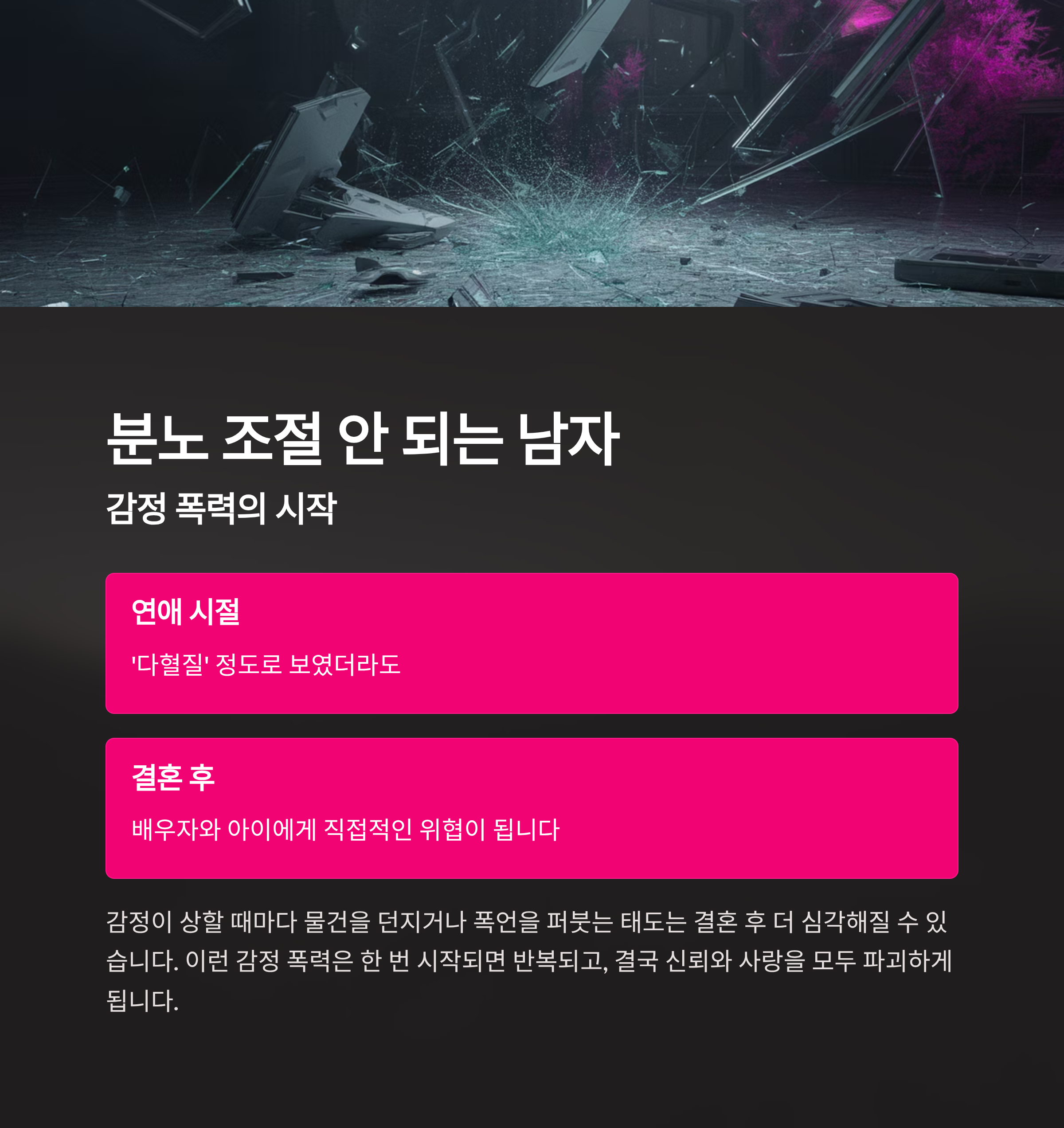 연애 시절에는 ‘다혈질’ 정도로 보였더라도, 결혼하면 배우자와 아이에게 직접적인 위협이 됩니다.