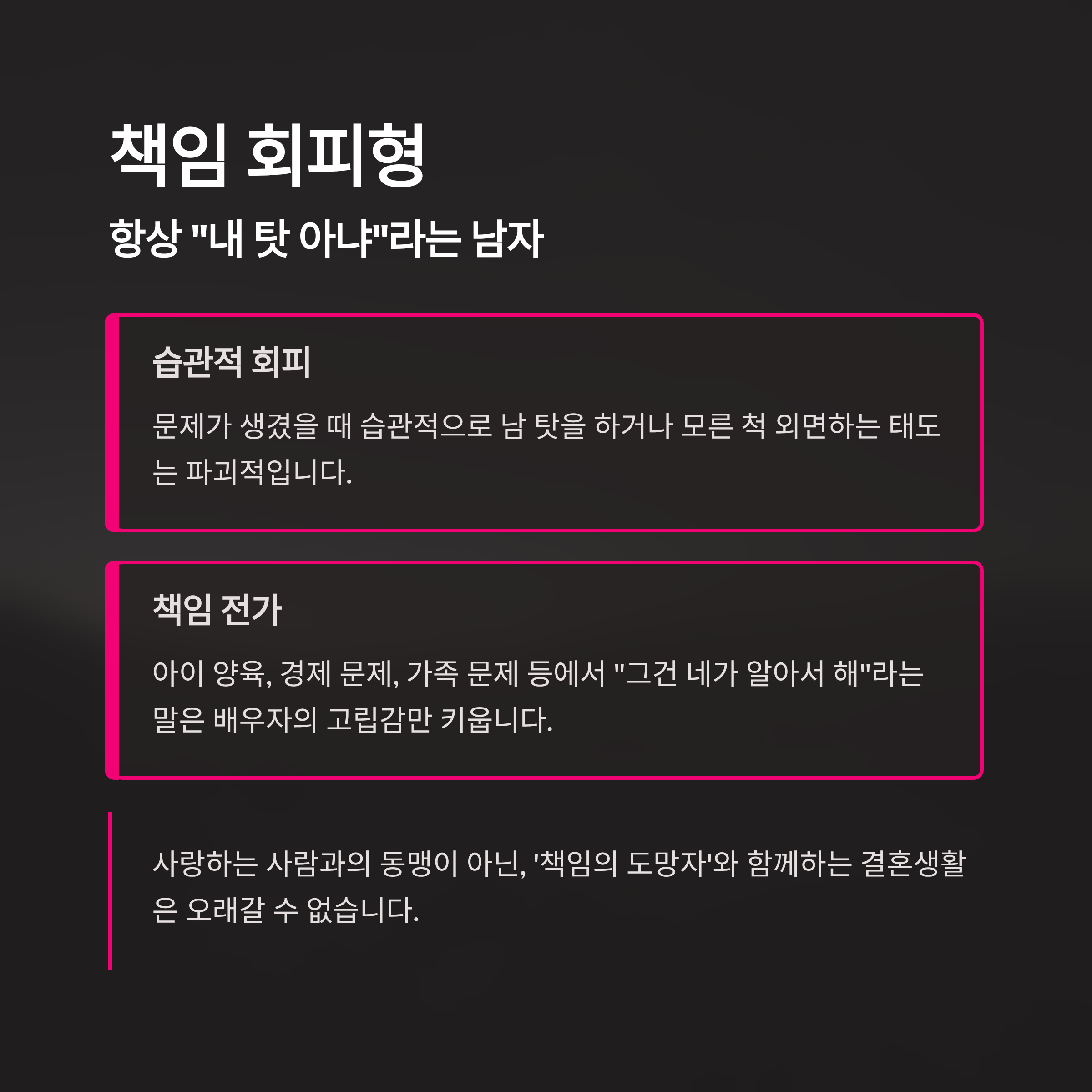 결혼은 사랑만으로 유지되기 어렵습니다. 함께 살아가는 일상 속에서 ‘성숙한 책임감’과 ‘현실 감각’이 부족한 사람은 결국 상대에게 피로와 상처만 남기게 됩니다. 실제 결혼 경험자들과 전문가들이 공통적으로 지적하는 문제 남성의 유형들을 정리해보았습니다. 연애 시절 놓치기 쉬운 경고 신호, 지금부터 꼭 기억해두세요.