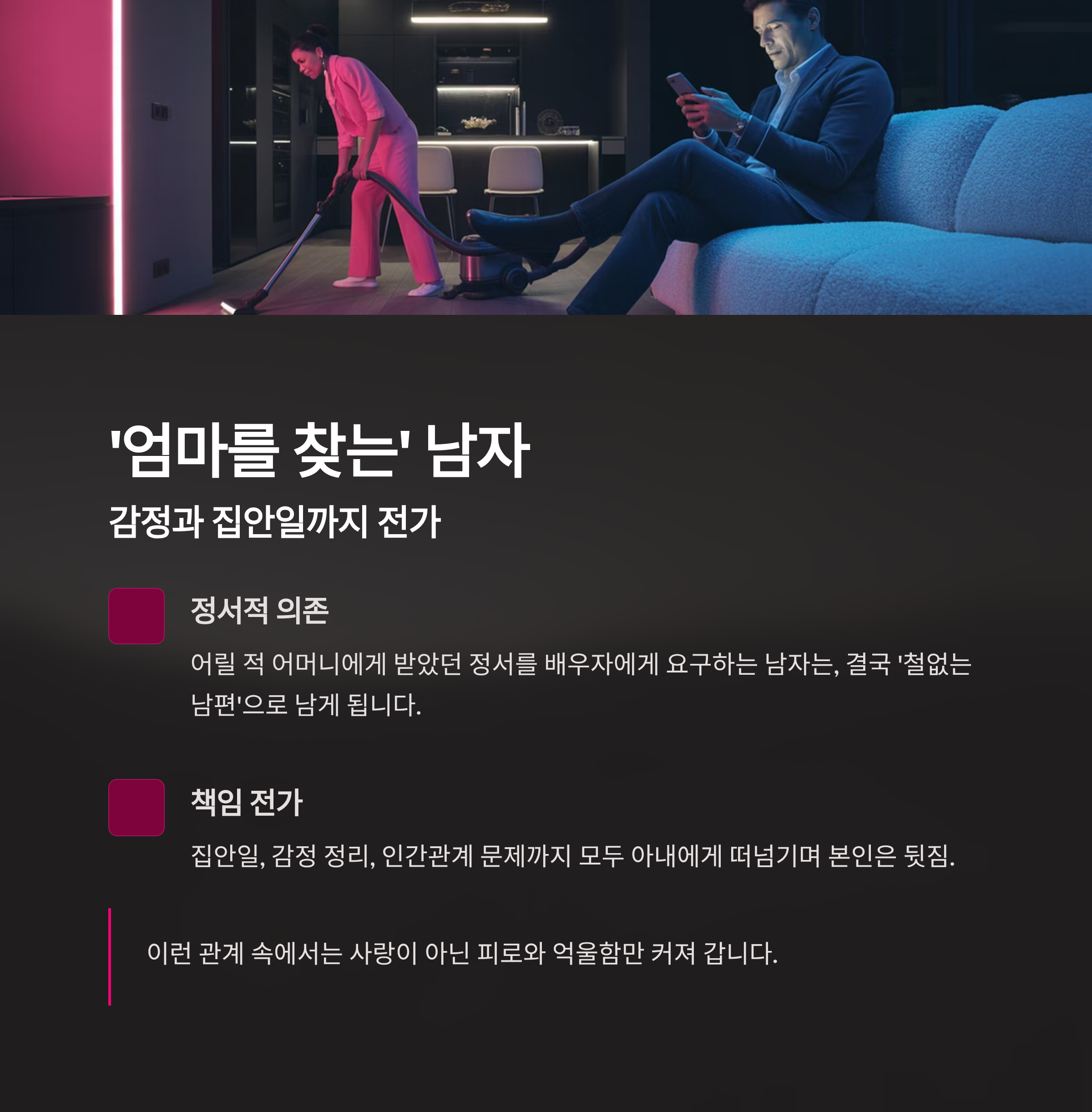 어릴 적 어머니에게 받았던 정서를 배우자에게 요구하는 남자는, 결국 ‘철없는 남편’으로 남게 됩니다.