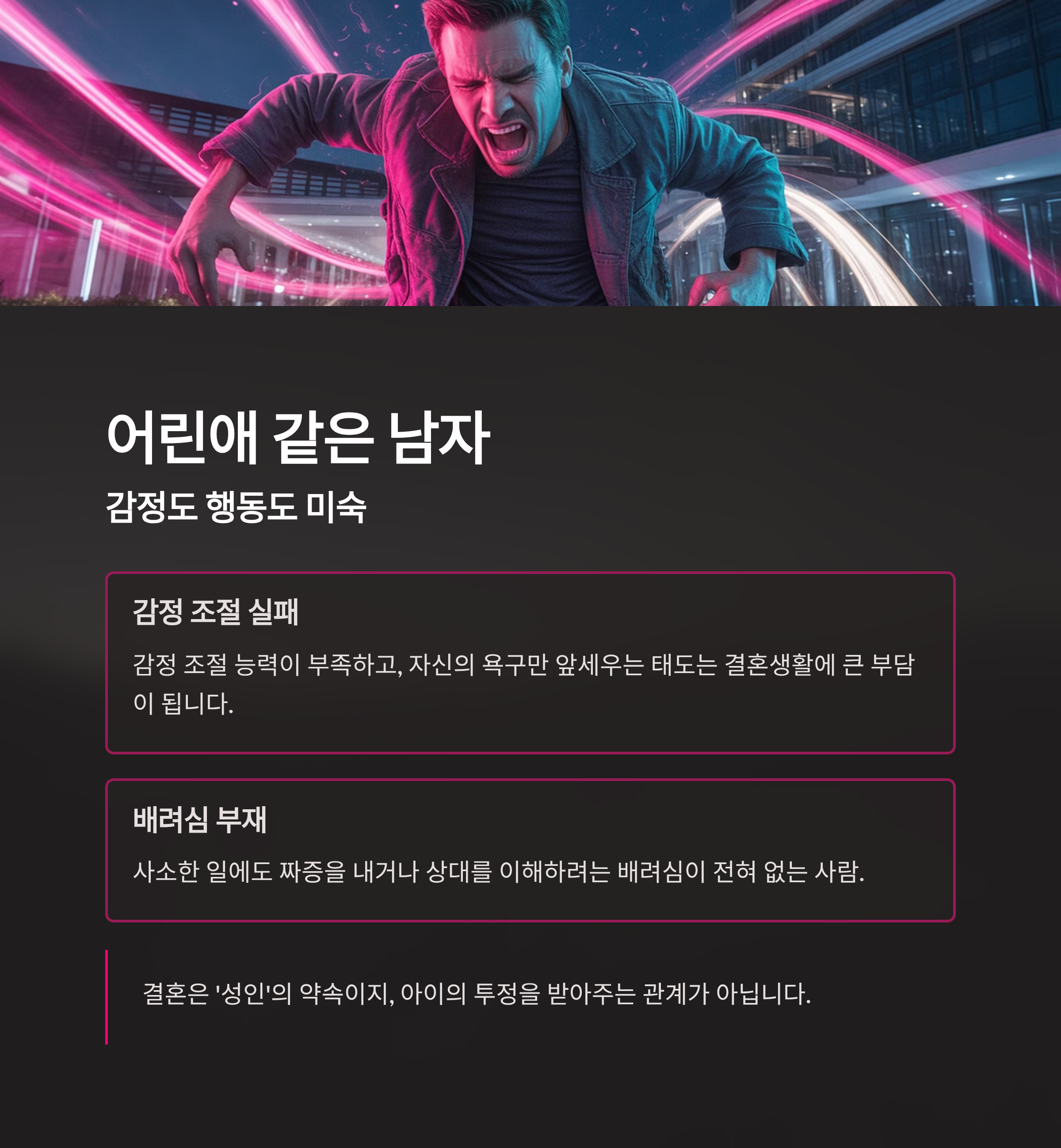 감정 조절 능력이 부족하고, 자신의 욕구만 앞세우는 태도는 결혼생활에 큰 부담이 됩니다.