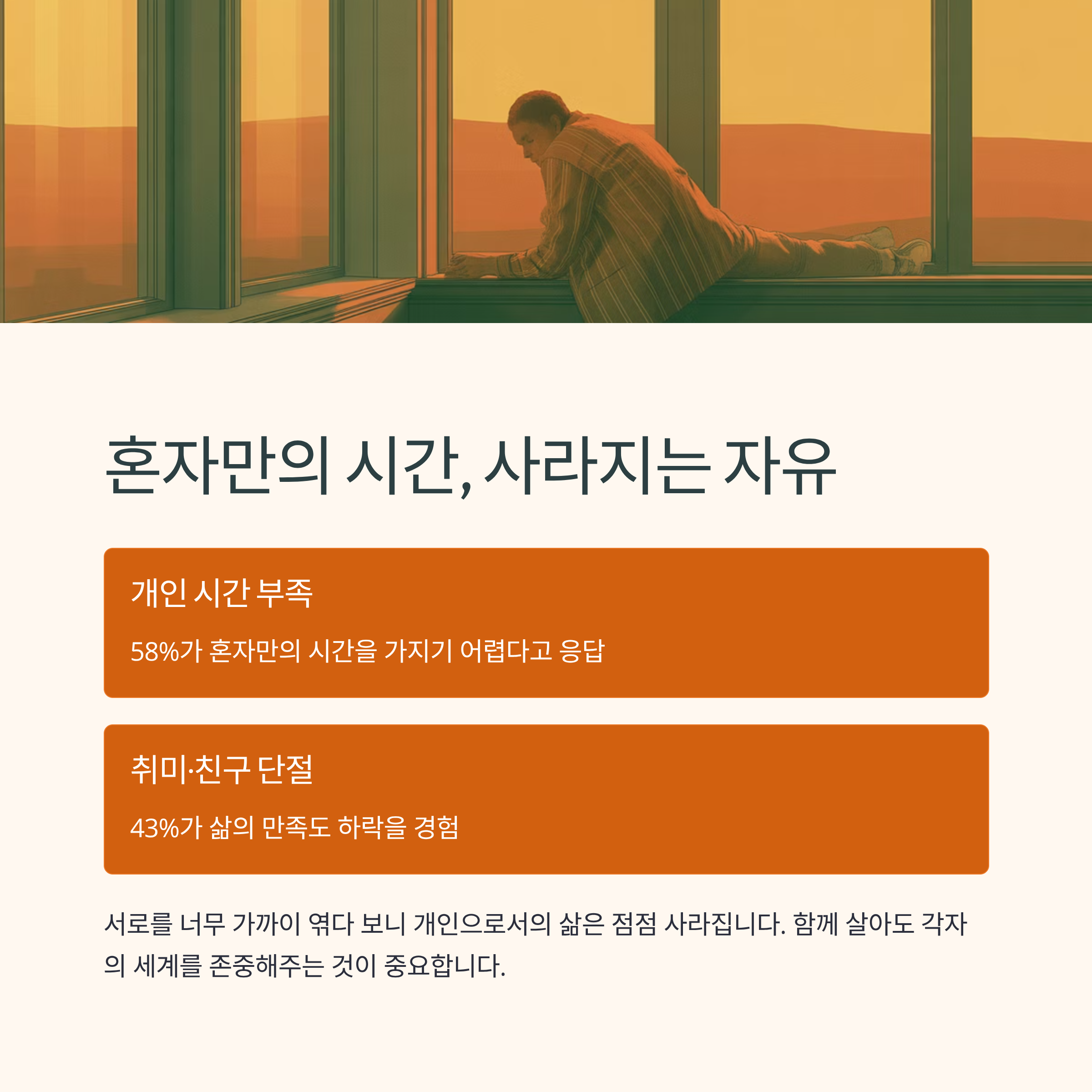 58%의 부부가 “혼자만의 시간을 가지기 어렵다”고 했고, 43%는 “취미나 친구 관계의 단절로 삶의 만족도가 떨어졌다”고 응답했습니다.