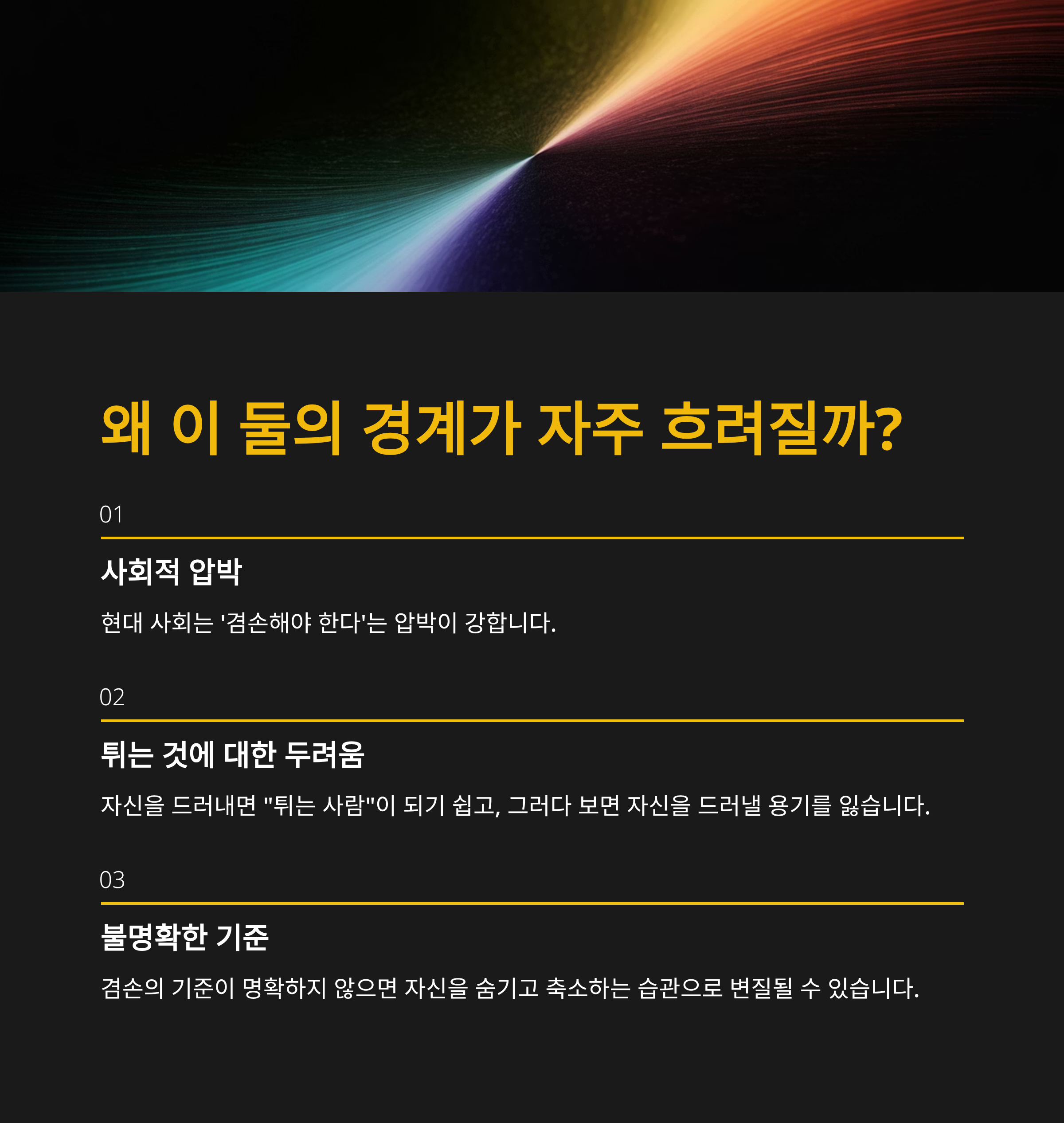겸손은 미덕이지만, 그 기준이 명확하지 않으면 자신을 숨기고 축소하는 습관으로 변질될 수 있습니다.