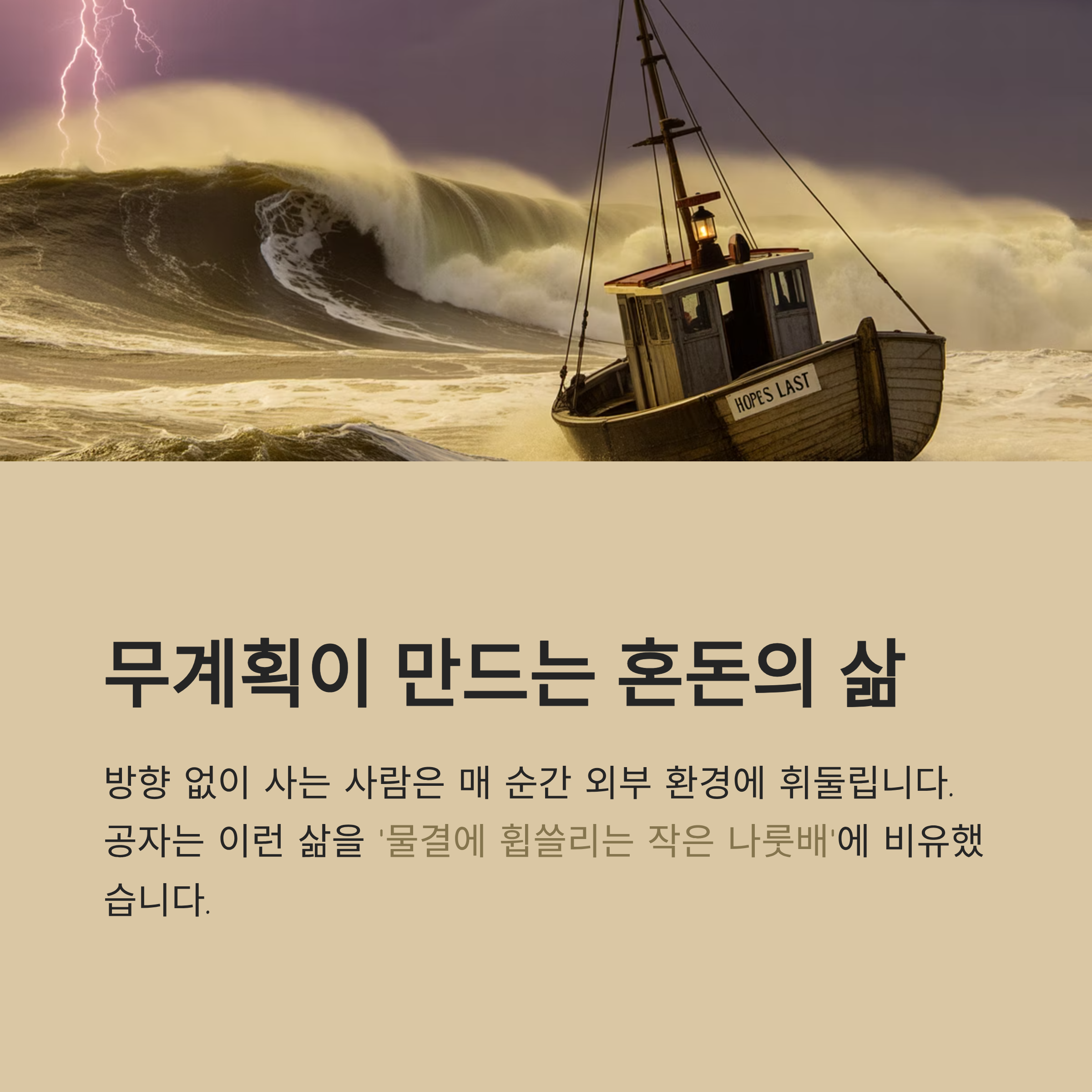 공자는 이런 삶을 ‘물결에 휩쓸리는 작은 나룻배’에 비유했습니다.