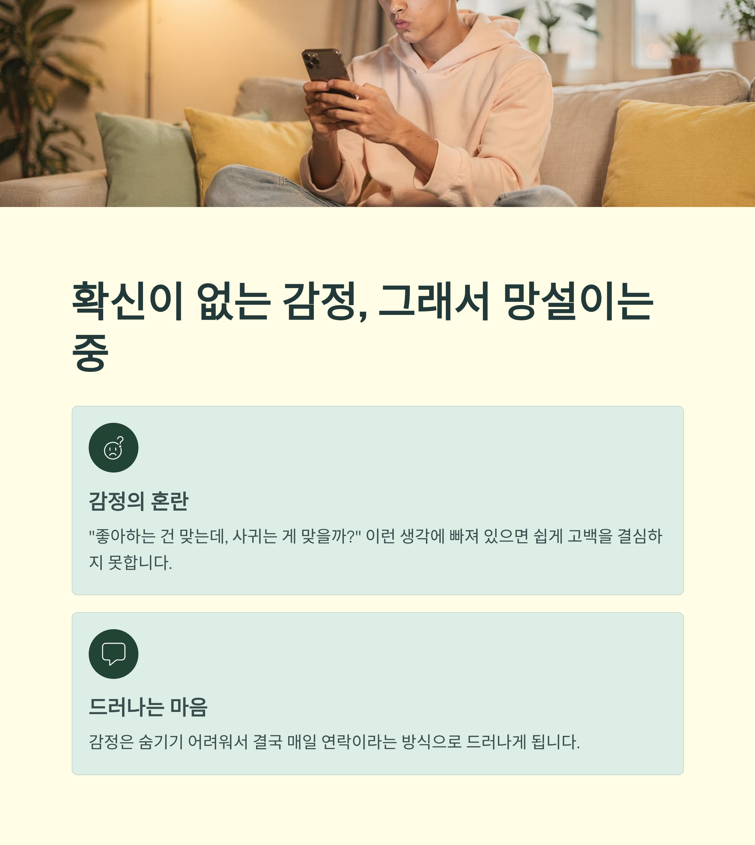 이런 생각에 빠져 있으면 쉽게 고백을 결심하지 못하죠.