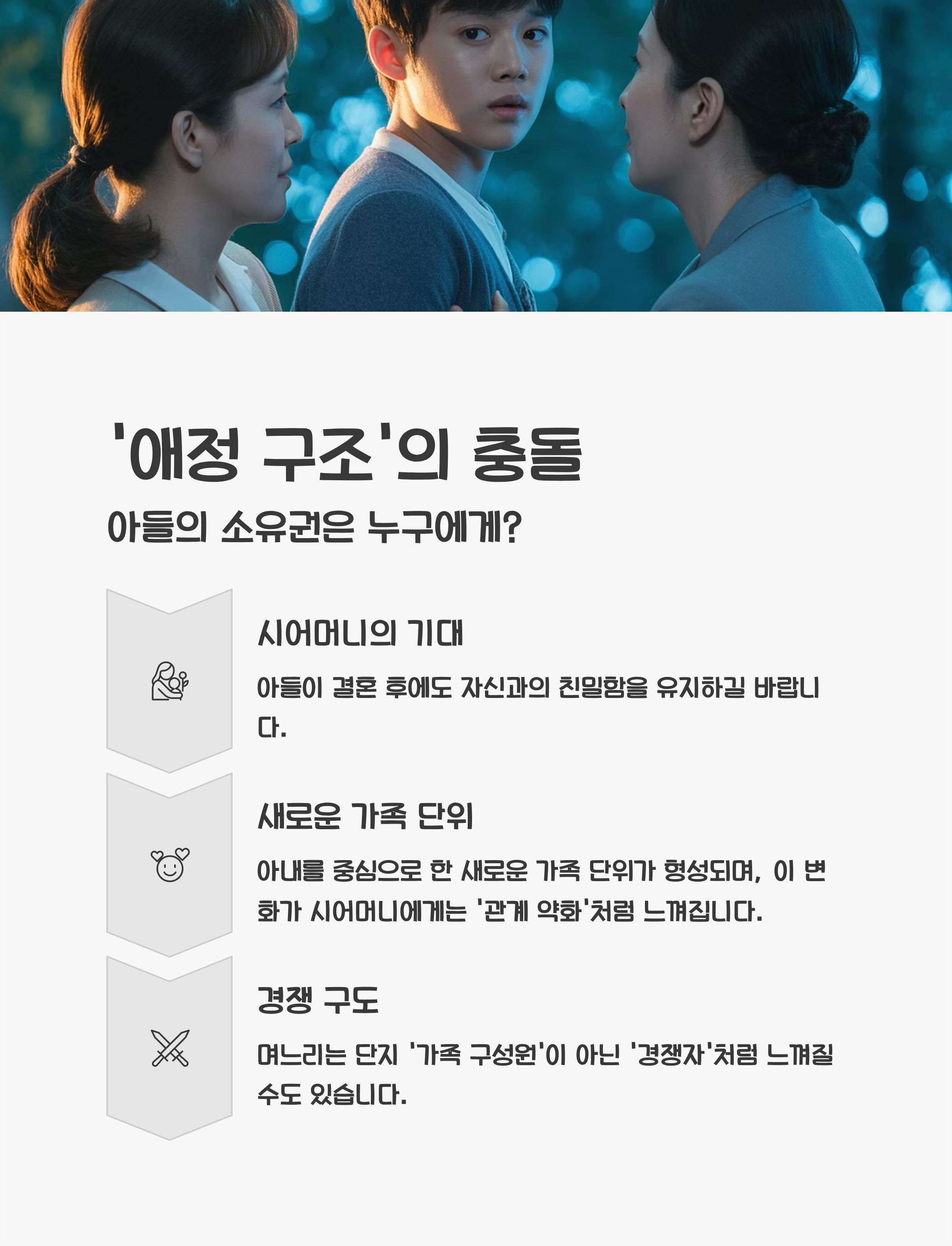 하지만 현실은 다릅니다. 아내를 중심으로 한 새로운 가족 단위가 형성되며, 이 변화가 시어머니에게는 '관계 약화'처럼 느껴지는 거죠.