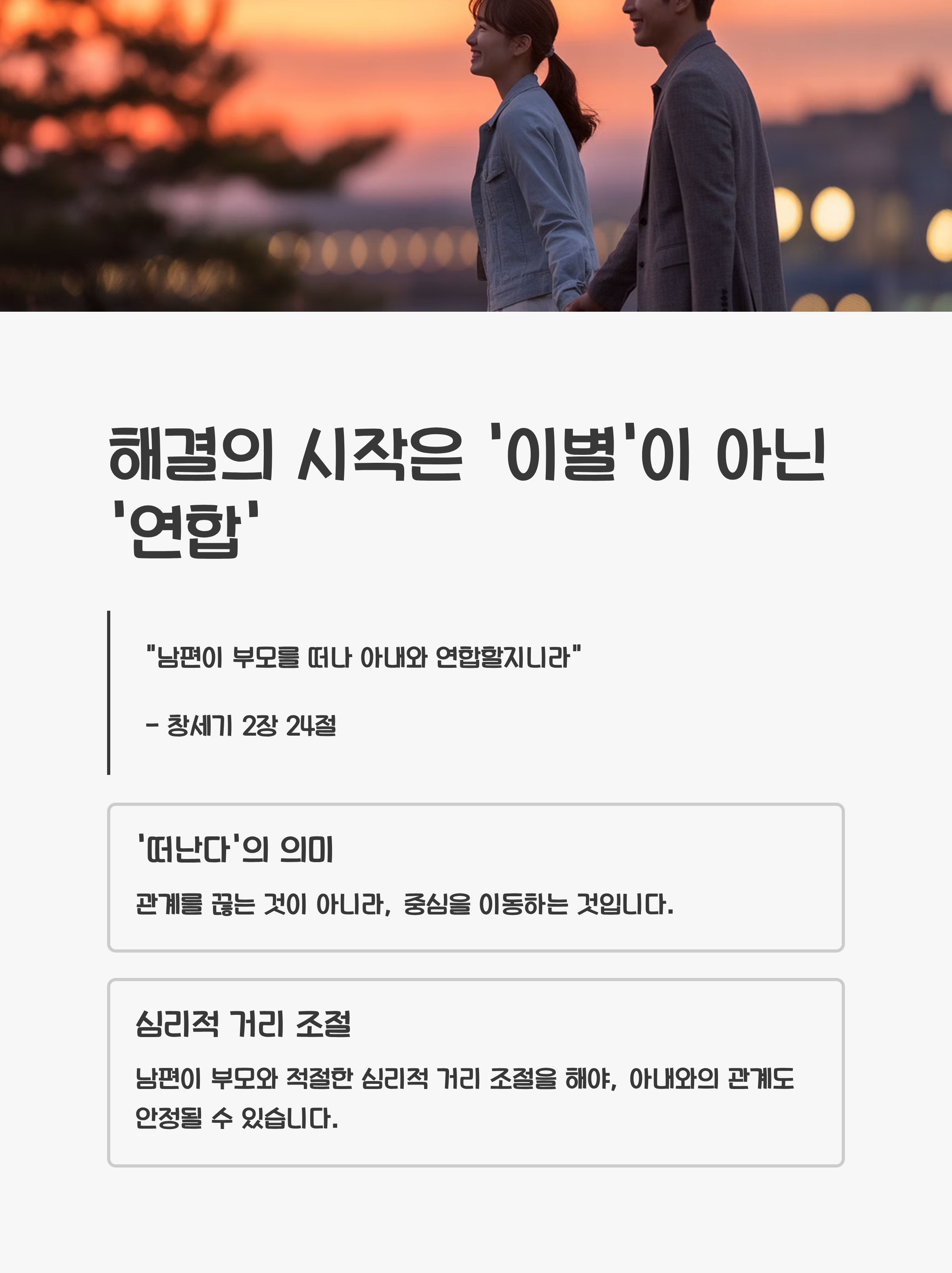 성경 창세기 2장 24절에는 "남편이 부모를 떠나 아내와 연합할지니라"는 말이 나옵니다.