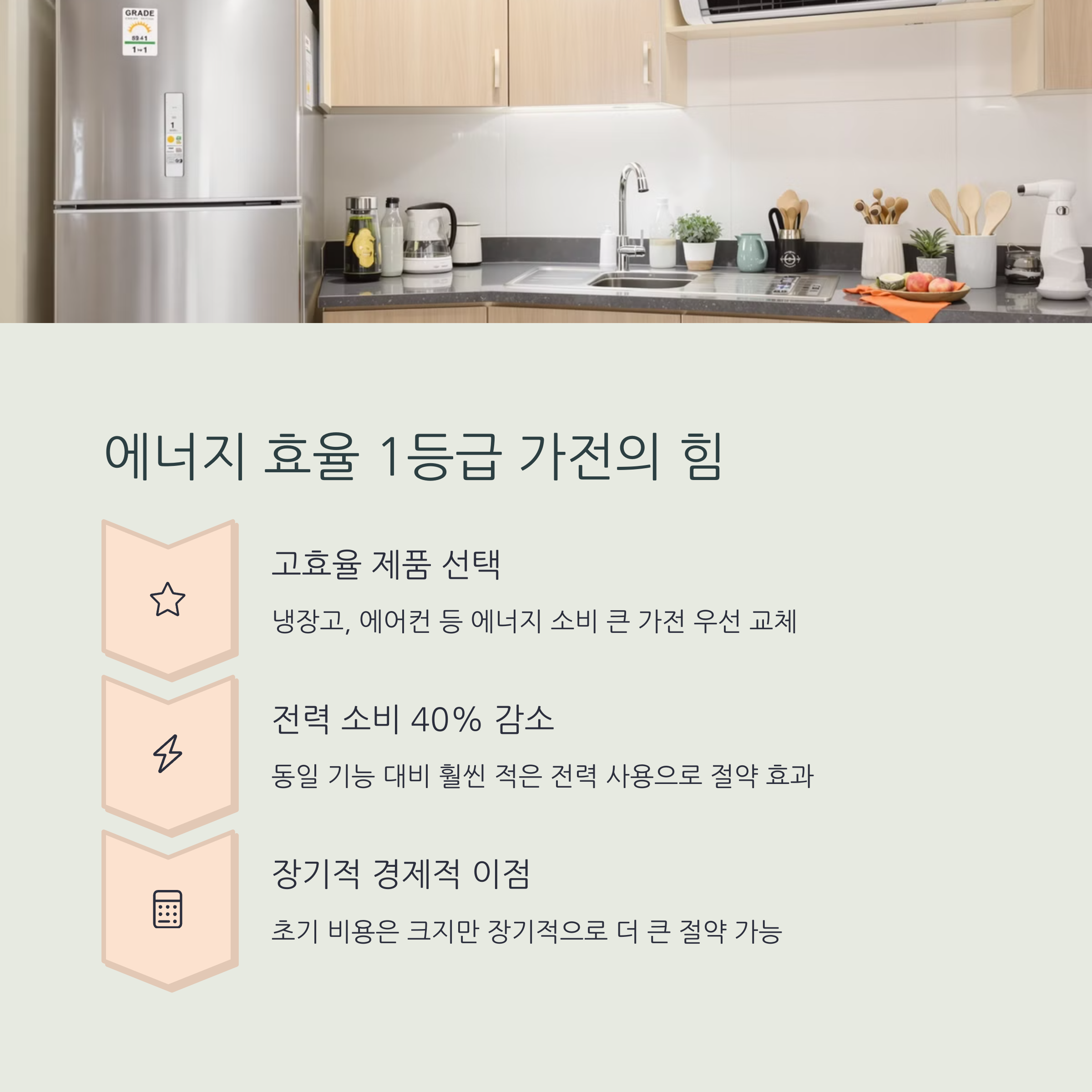 | 에너지 효율 1등급 | 고효율 가전 사용으로 월 평균 10% 이상 절감 |