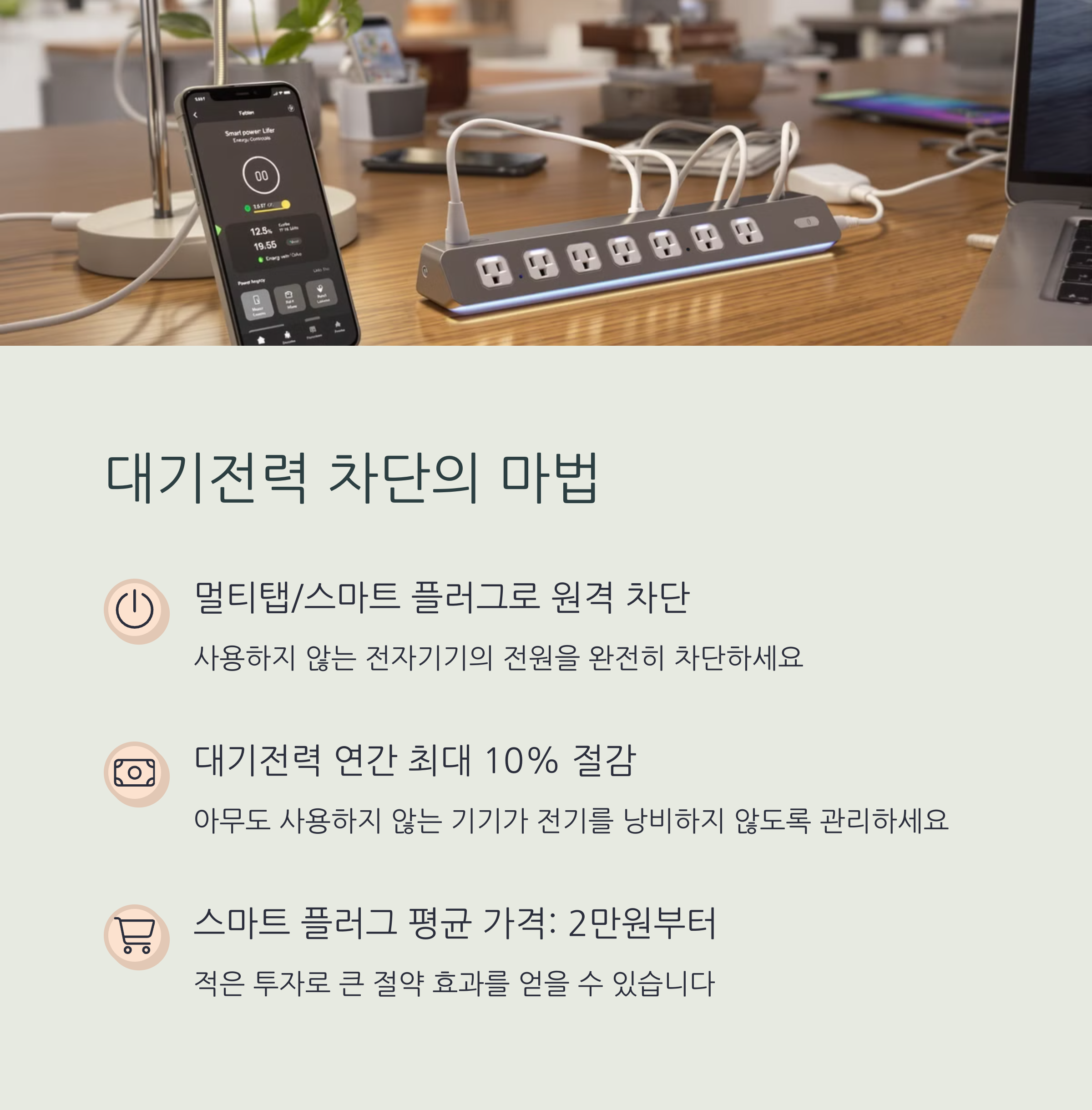 | 대기전력 10% 절감 | 월 최대 12,000원 절약 | 월 전기요금 5~10% 절감 |