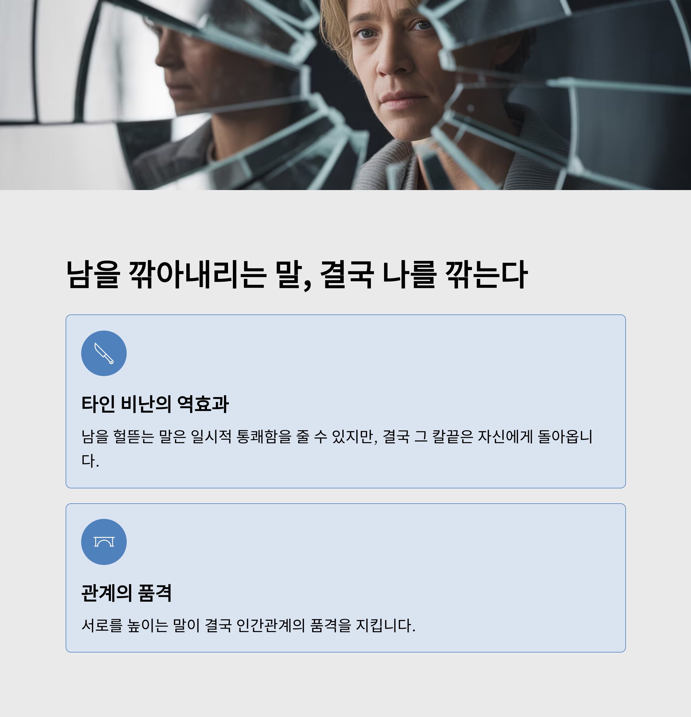 타인을 비난하는 말은 일시적 통쾌함은 줄 수 있을지 몰라도, 결국 그 칼끝은 자신에게 돌아온다고 보았습니다.