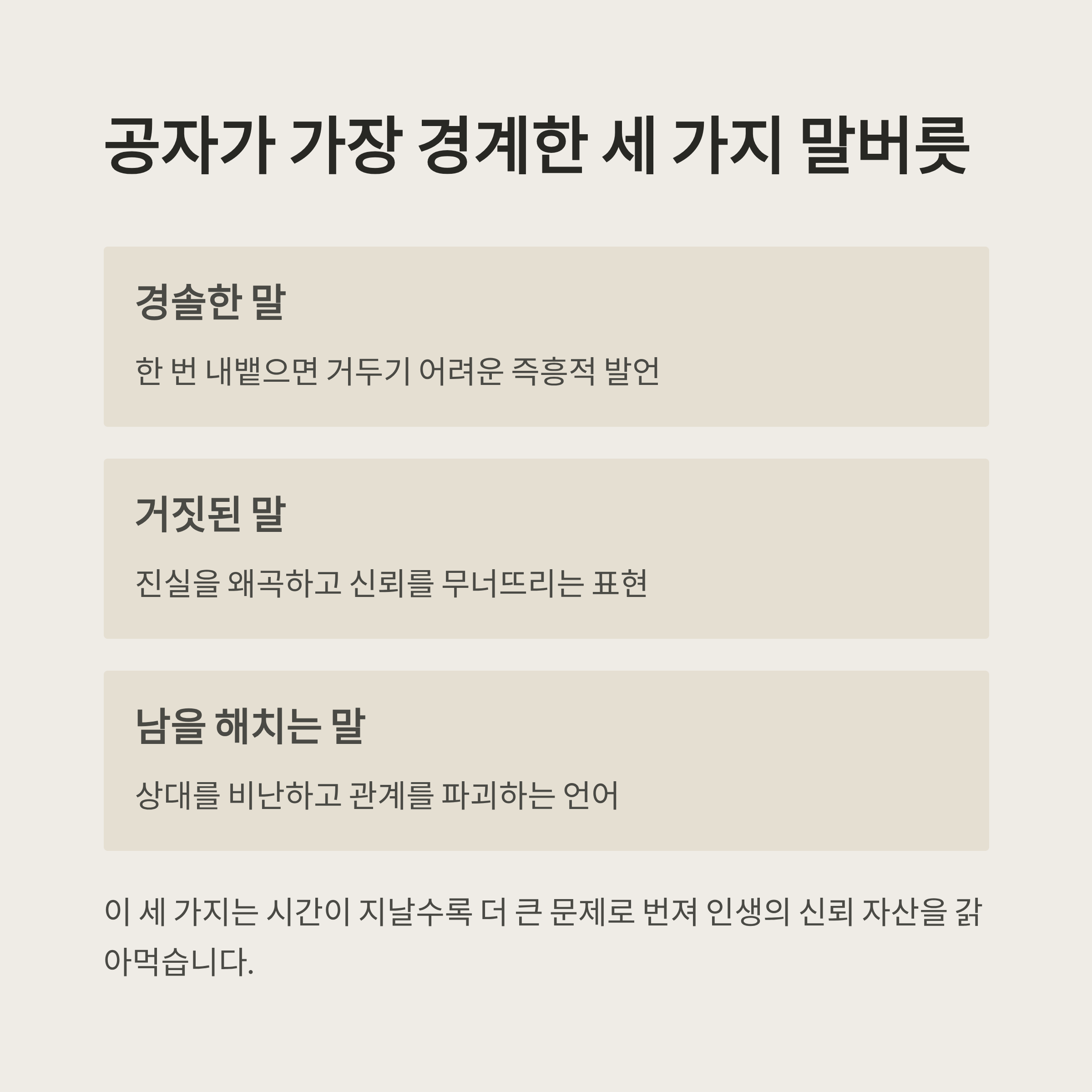 공자는 "경솔한 말, 거짓된 말, 남을 해치는 말"을 가장 위험하게 보았습니다.