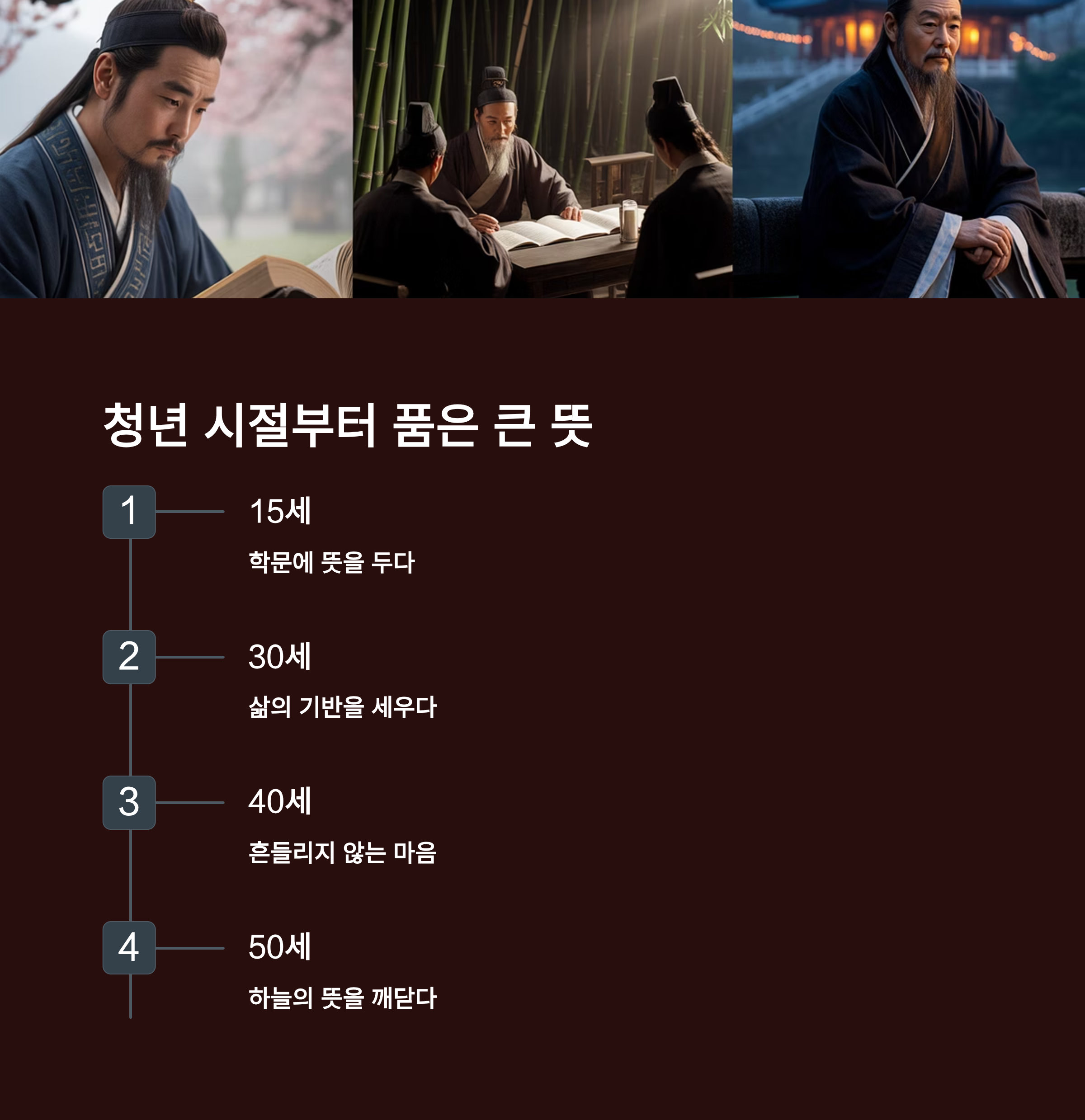 공자는 열다섯에 학문에 뜻을 두었고, 서른에 삶의 기반을 세웠습니다.