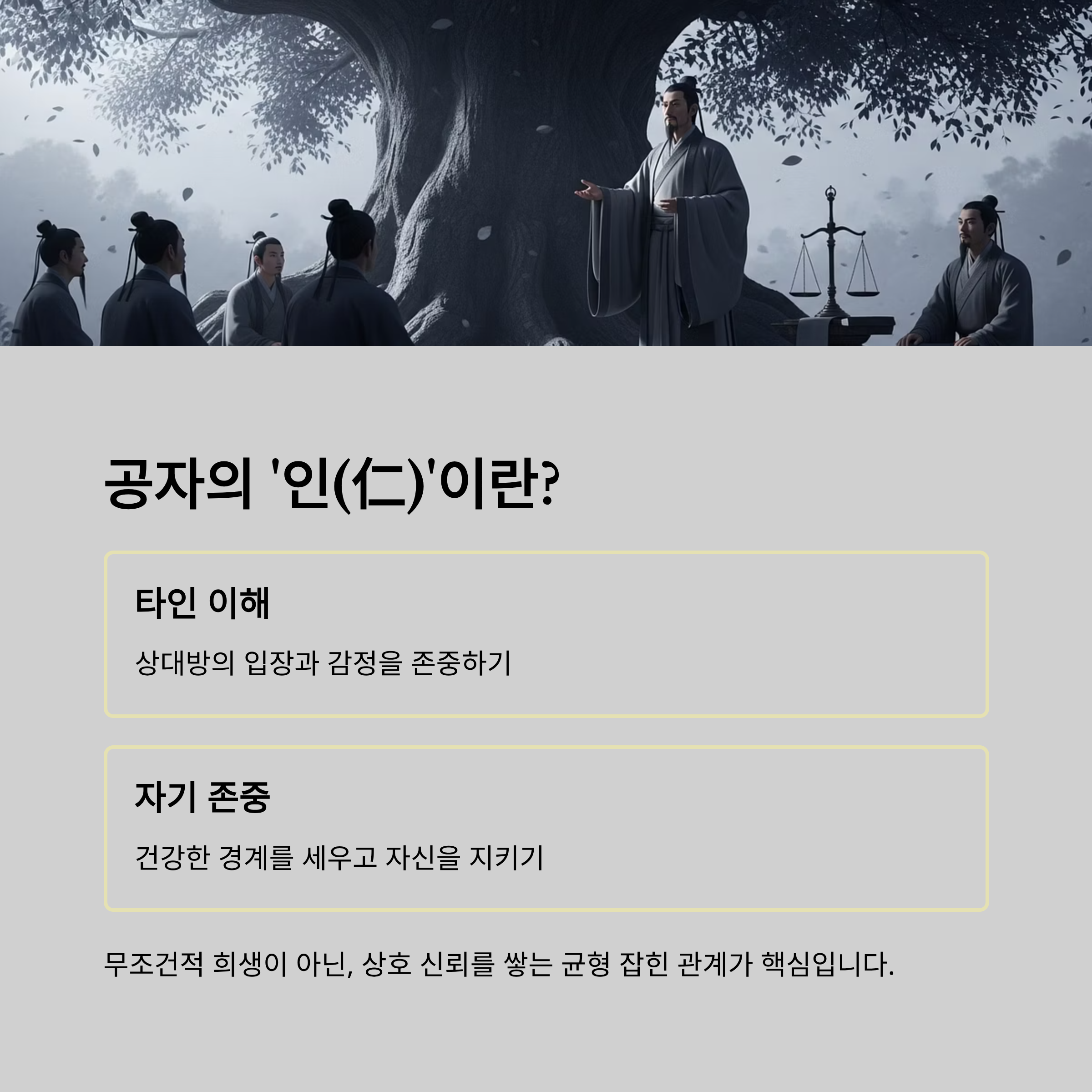 공자가 말한 ‘인’은 타인을 이해하는 동시에 자기 존중을 포함하는 개념입니다.