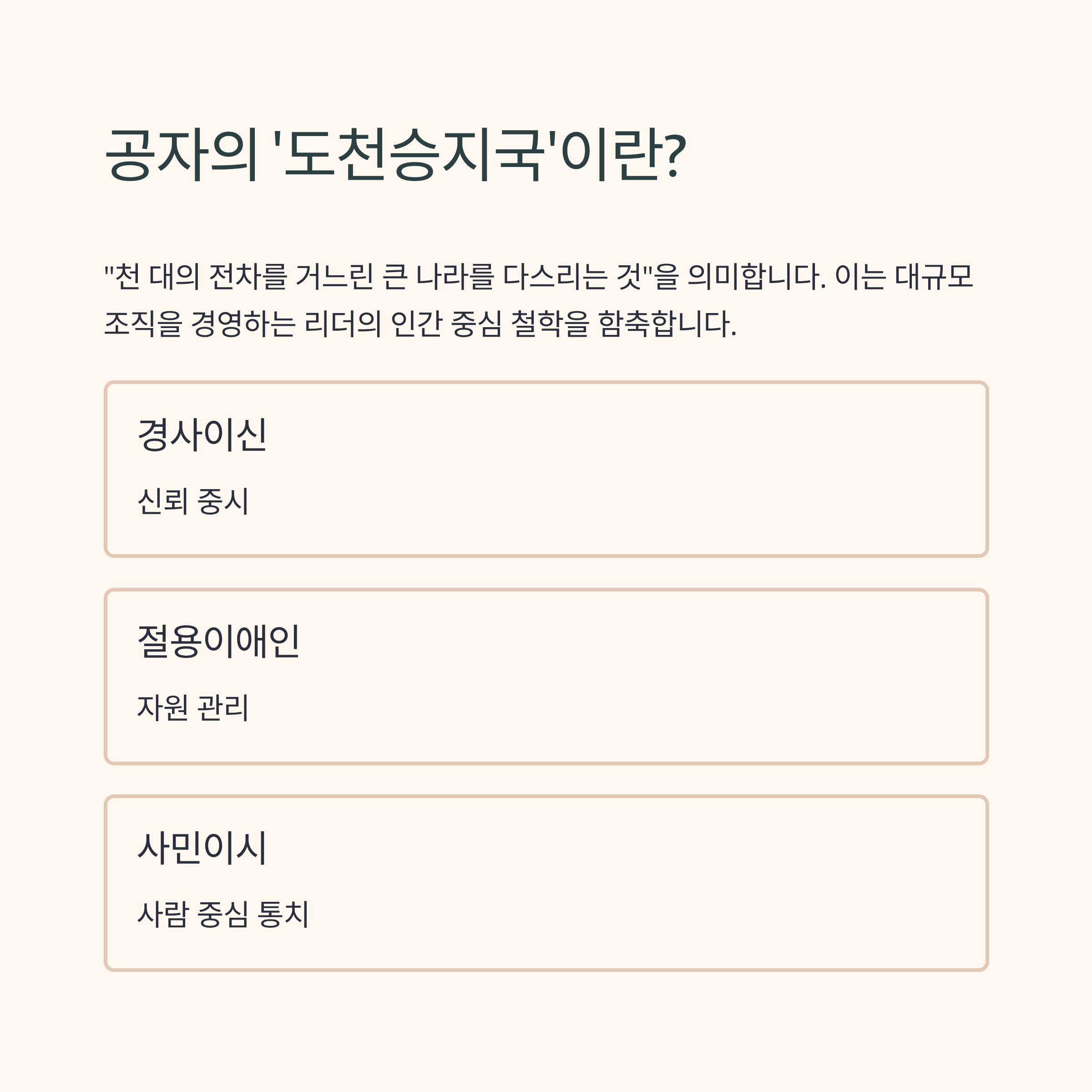 공자가 말한 '도천승지국(道千乘之國)'은 “천 대의 전차를 거느린 큰 나라를 다스리는 것”을 의미합니다. 이는 국가 또는 대규모 조직을 경영하는 리더의 입장을 상징하며, 이 구절은 단순한 통치가 아니라 인간 중심의 조직 운영 철학을 함축합니다. 이후 이어지는 세 가지 문장 ‘경사이신’, ‘절용이애인’, ‘사민이시’는 각각 신뢰, 자원 관리, 사람 중심 통치를 강조합니다.