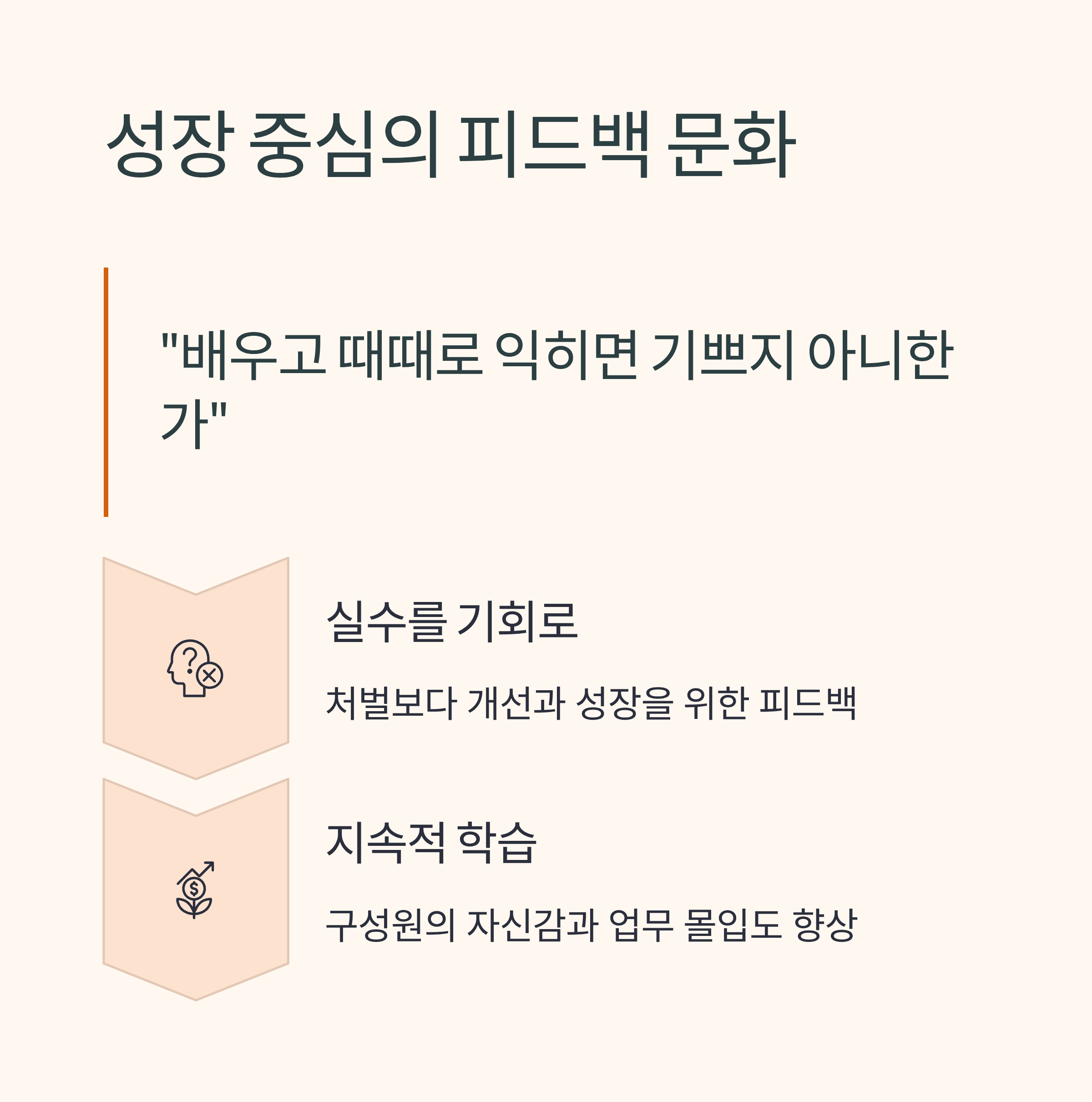 피드백 중심의 문화가 요구됩니다. 실수에 대한 처벌보다는 개선과