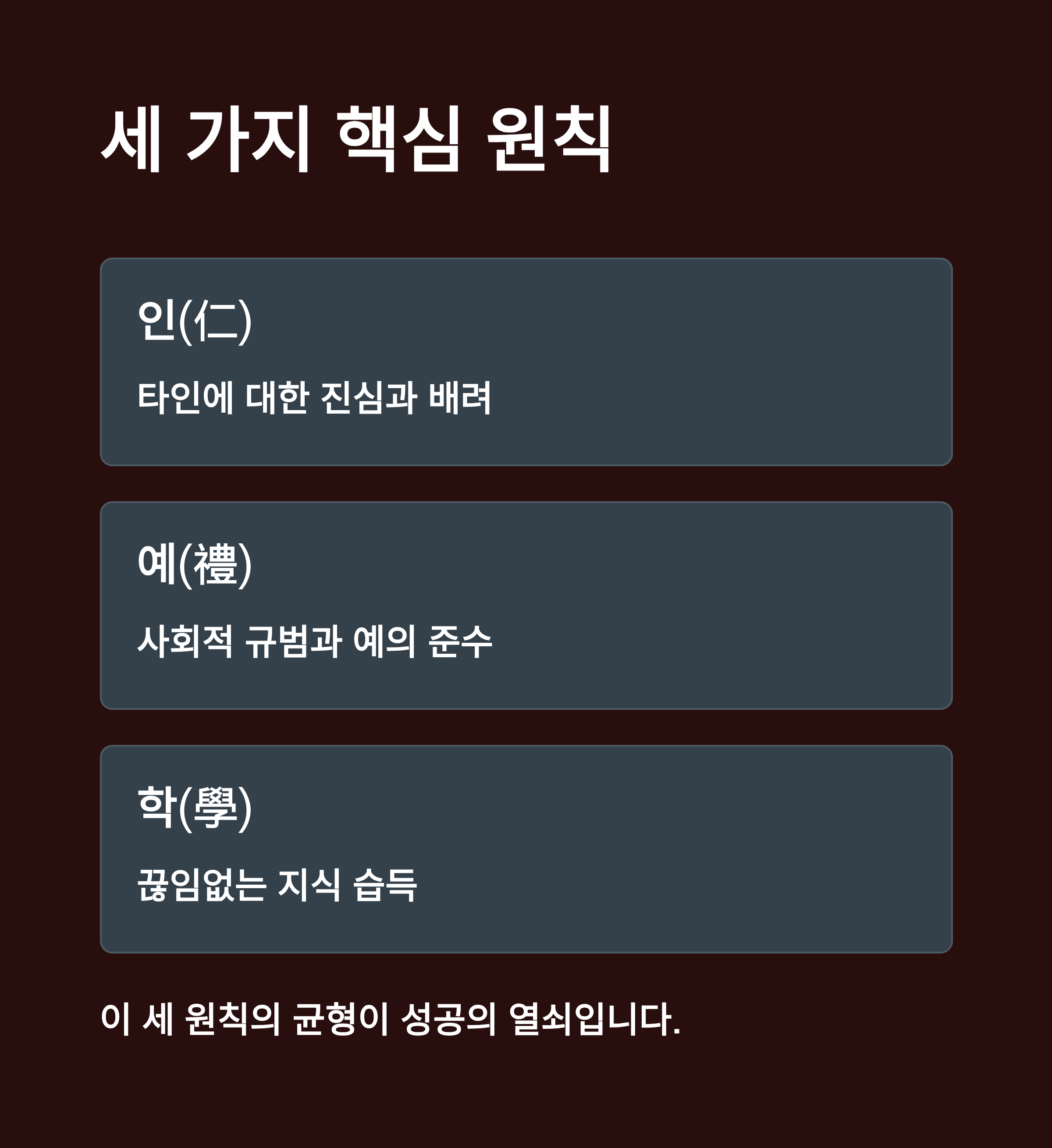 공자는 인(仁), 예(禮), 학(學)을 성공의 필수 조건으로 보았습니다.