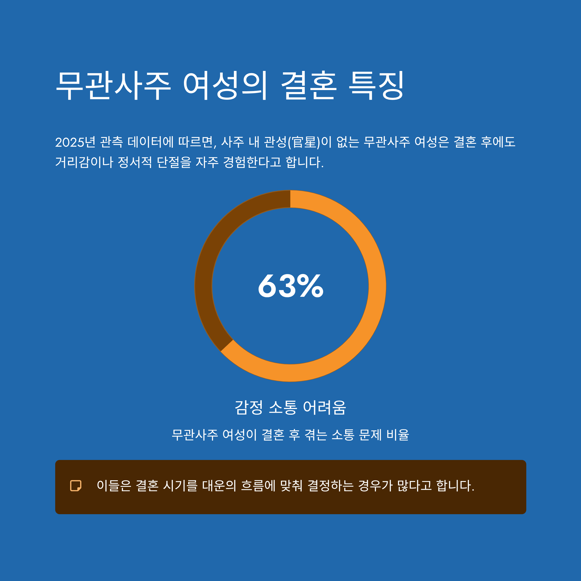 2025년 관측 데이터에 따르면, 사주 내 관성(官星)이 없는 무관사주 여성은 결혼 후에도 거리감이나 정서적 단절을 자주 경험한다고 합니다. 실제로 무관사주 여성 중 63%가 결혼 후 감정 소통에 어려움을 겪었다는 분석이 있었으며, 이들은 결혼 시기를 대운의 흐름에 맞춰 결정하는 경우가 많다고 합니다.