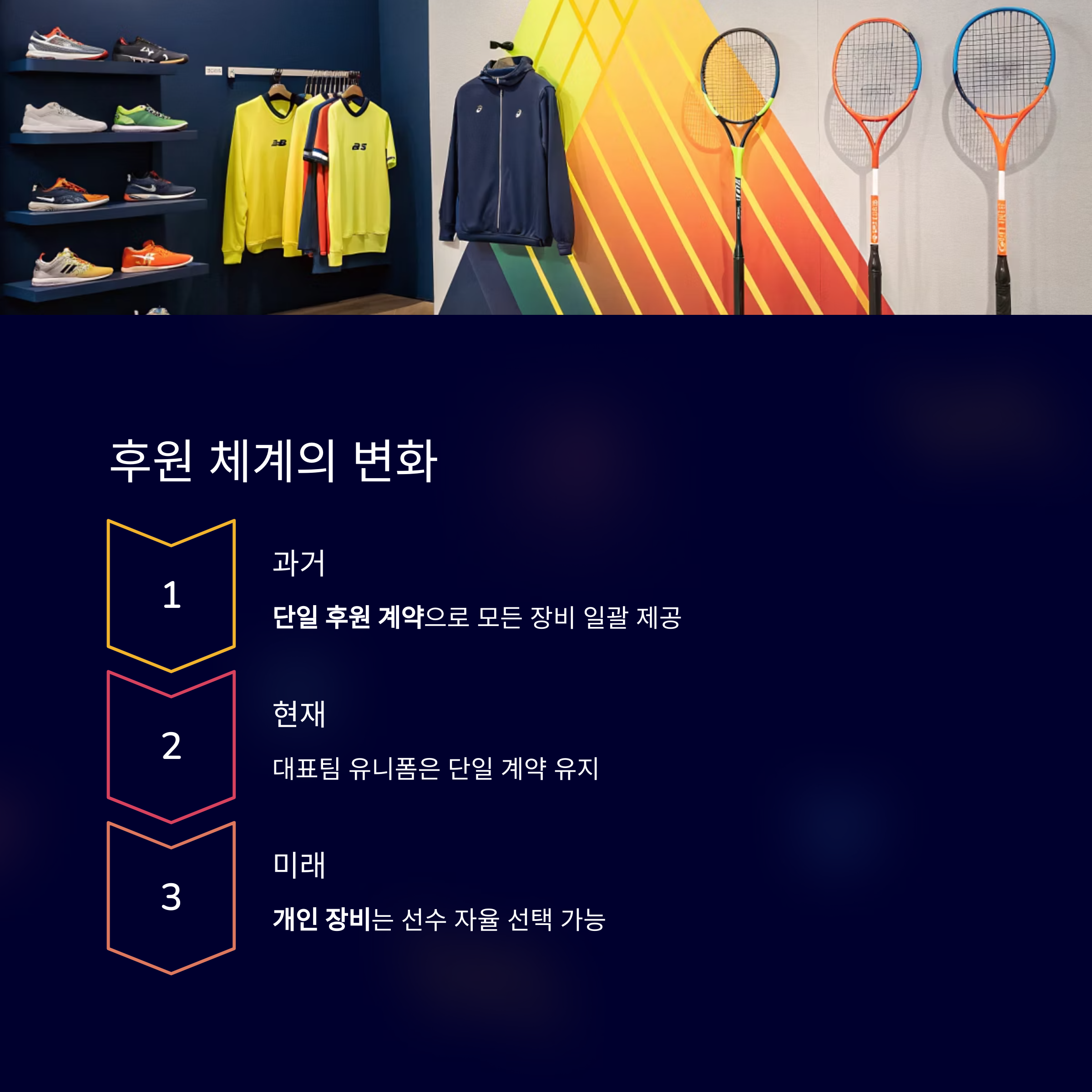 기존 국가대표팀은 주로 단일 후원 계약에 의존해 모든 선수의 장비를 일괄 제공받았습니다.