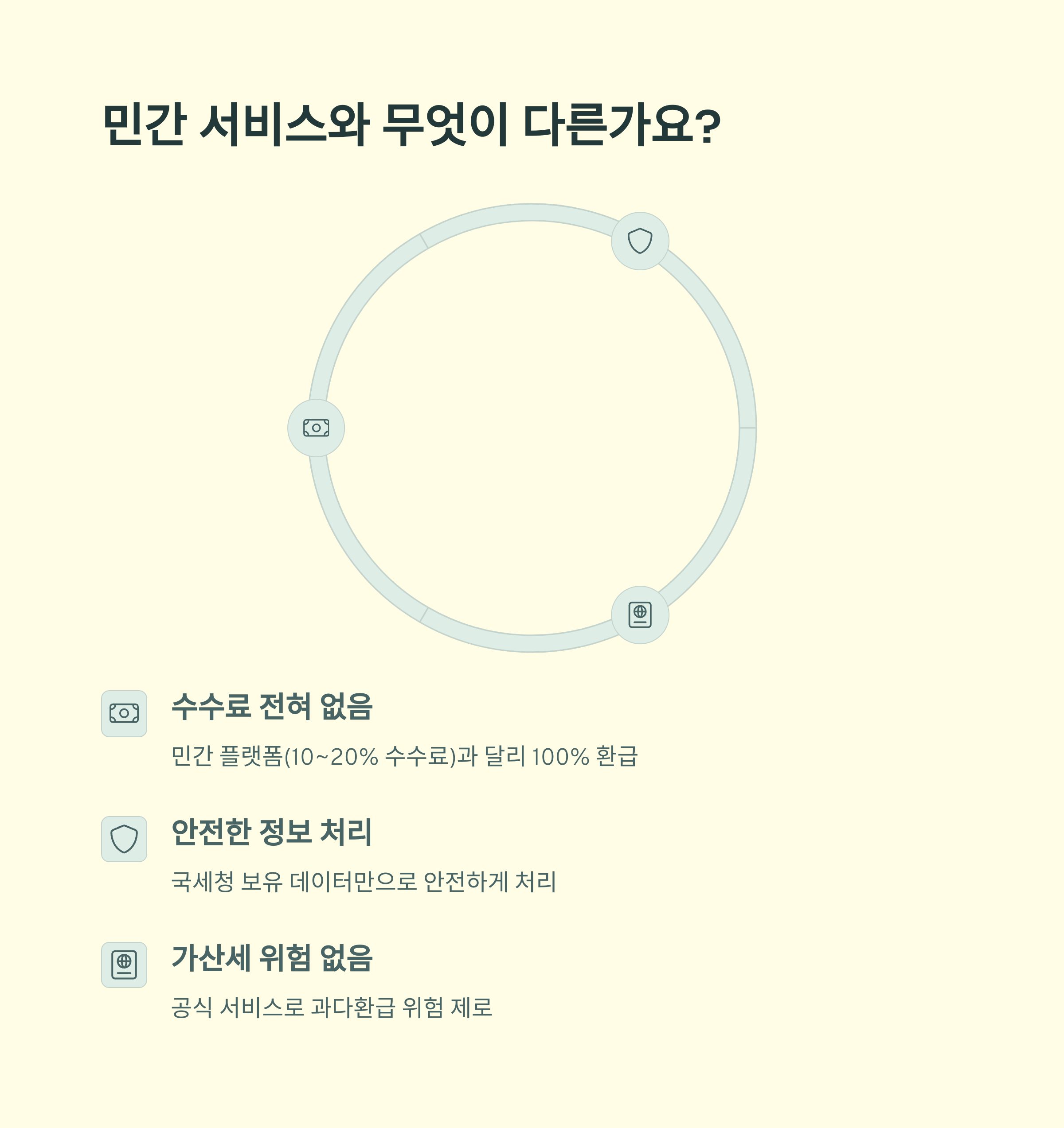 이 서비스의 가장 큰 장점은 무료라는 점입니다. 기존의 민간 플랫폼은 환급액의 10~20%를 수수료로 받는 반면, ‘원클릭’은 국세청이 직접 운영하며 전액 무료로 제공됩니다. 또한, 개인정보 보호 측면에서도 우수합니다. 국세청은 이미 보유 중인 데이터를 기반으로 환급 대상자에게 안내하며, 추가적인 개인정보 수집이 전혀 없습니다. 안심하고 이용할 수 있는 이유입니다.