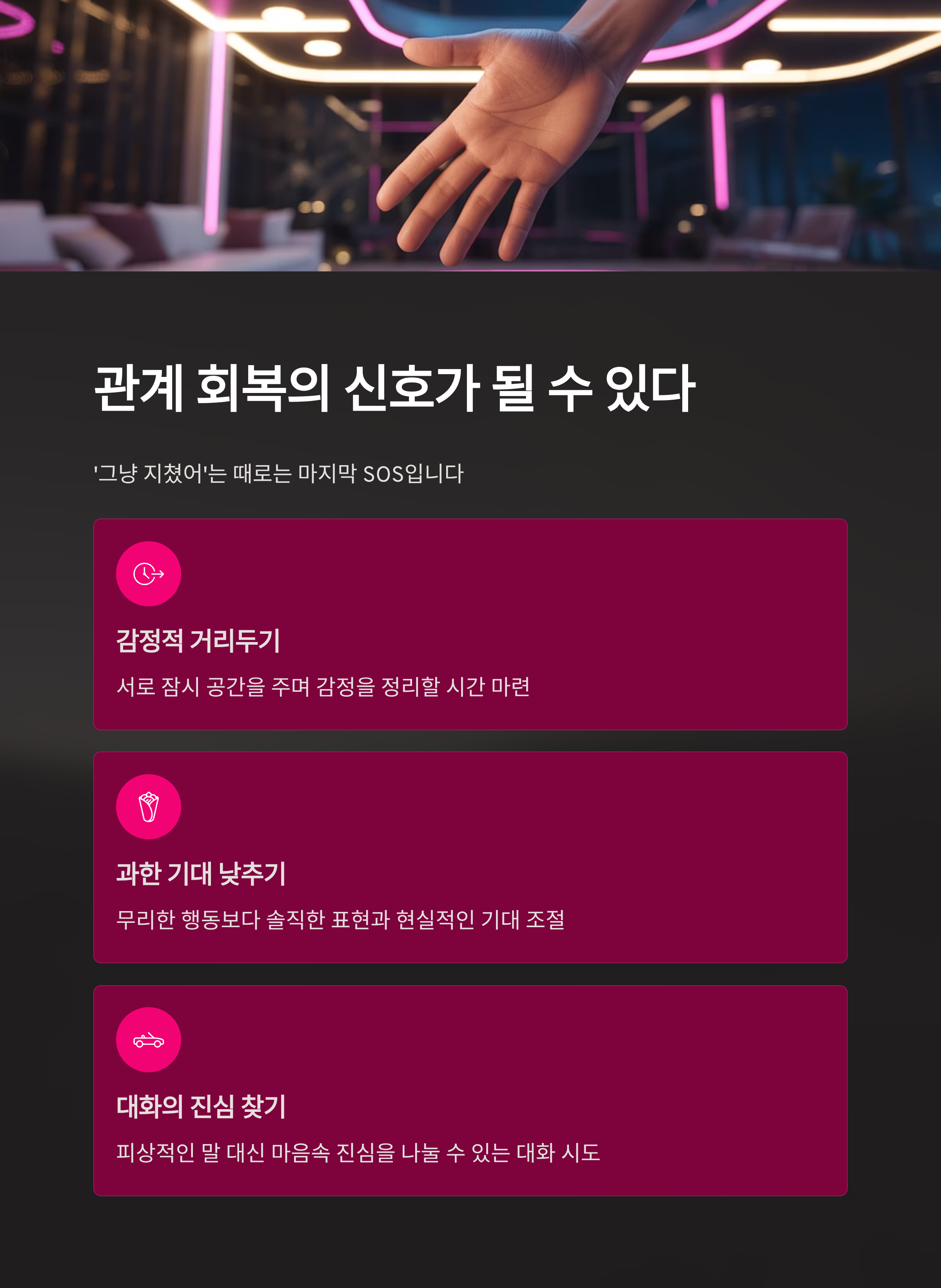 | 과한 기대 낮추기 | 상대를 위해 무리한 행동보다 솔직한 표현과 현실적인 기대 조절 |