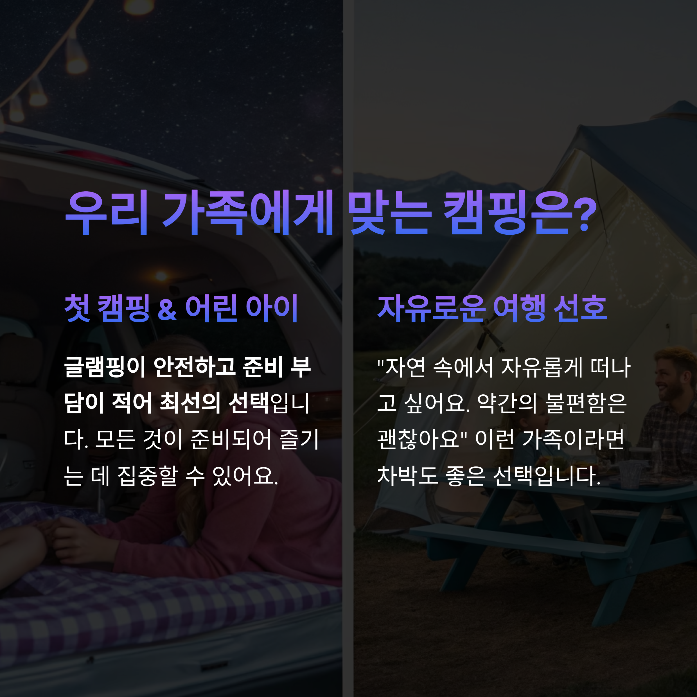 가족 캠핑을 준비하는 분들께는 글램핑과 차박 모두 흥미로운 선택지입니다.