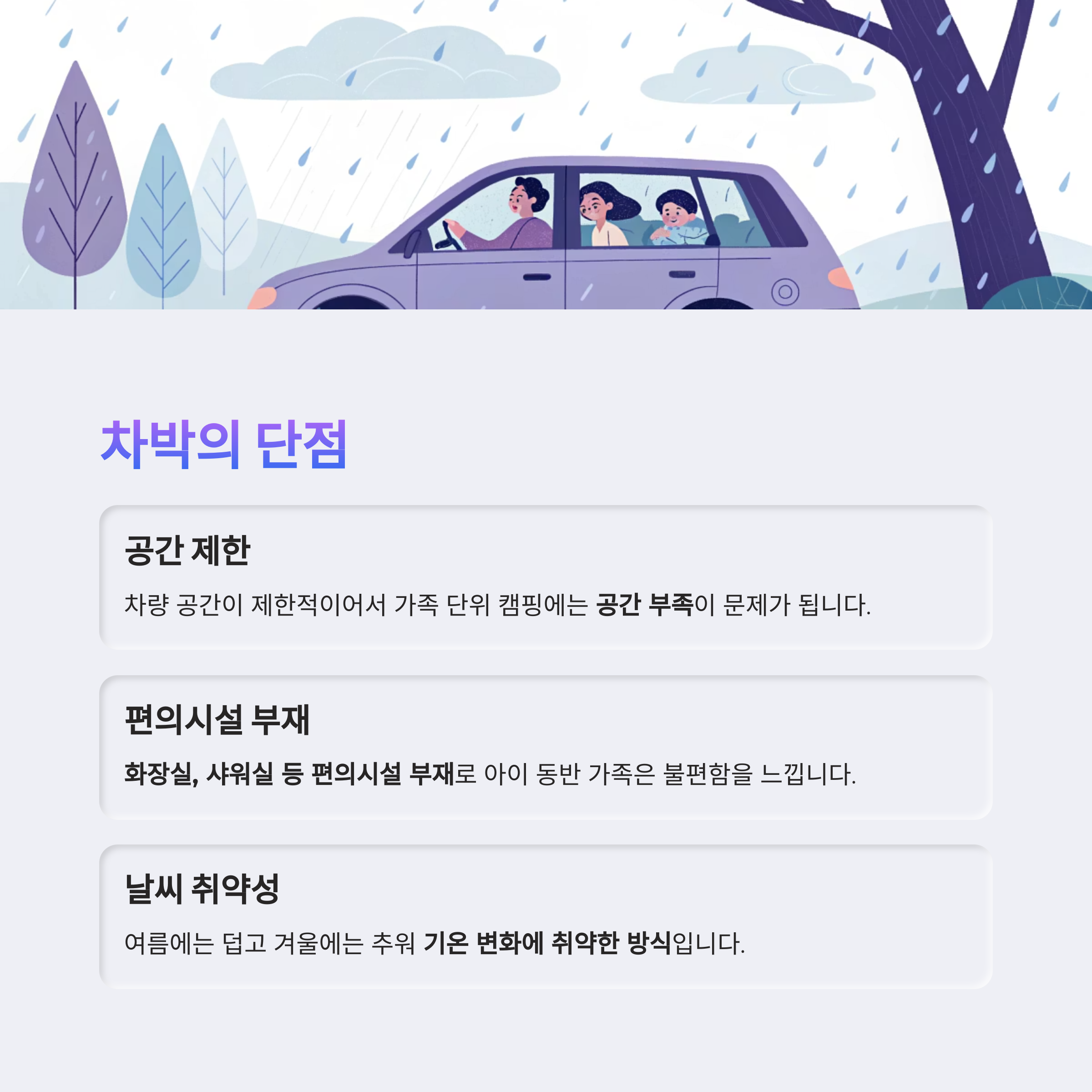 하지만 차박은 차량 공간이 제한적이어서 가족 단위 캠핑에는 공간 부족이 큰 문제로 작용할 수 있습니다.