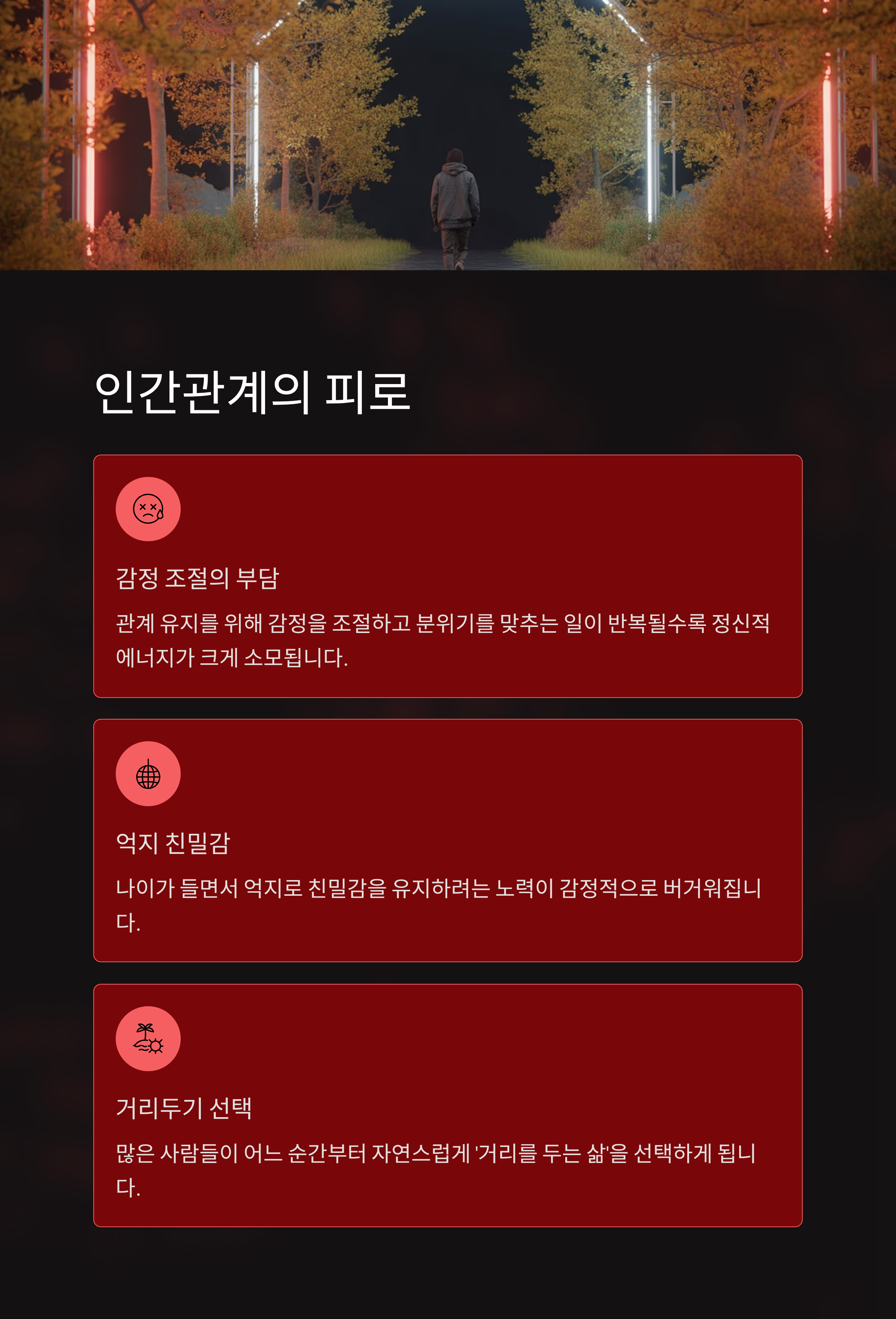 특히, 나이가 들면서는 ‘억지로 친밀감을 유지하려는 노력’이 감정적으로 버거워집니다. 이로 인해 많은 사람들이 어느 순간부터 자연스럽게 ‘거리를 두는 삶’을 선택하게 되는 것이죠.