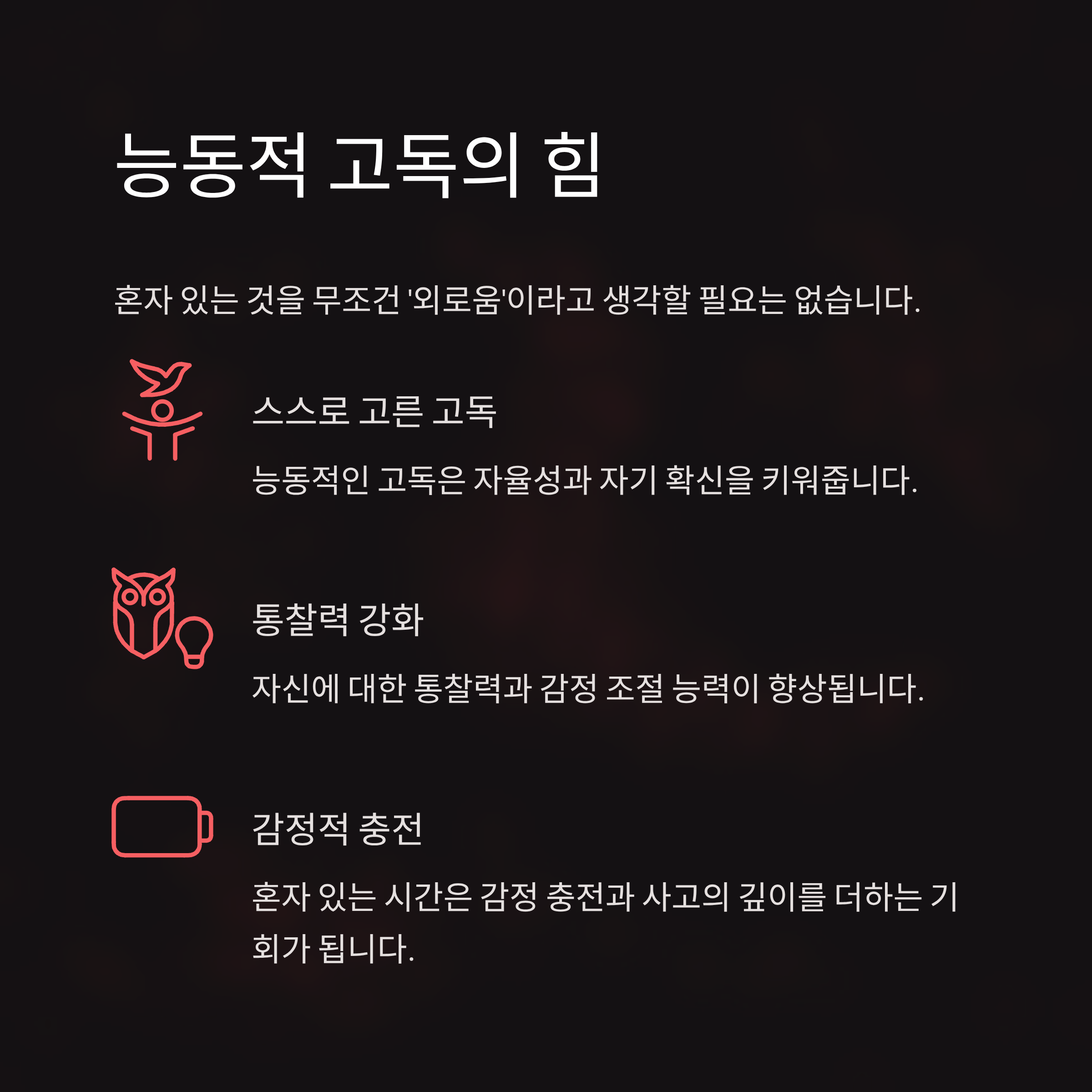 특히, 자신에 대한 통찰력과 감정 조절 능력이 있는 사람일수록 혼자 있는 시간을 감당할 줄 알고, 그 시간을 능동적으로 살아냅니다.