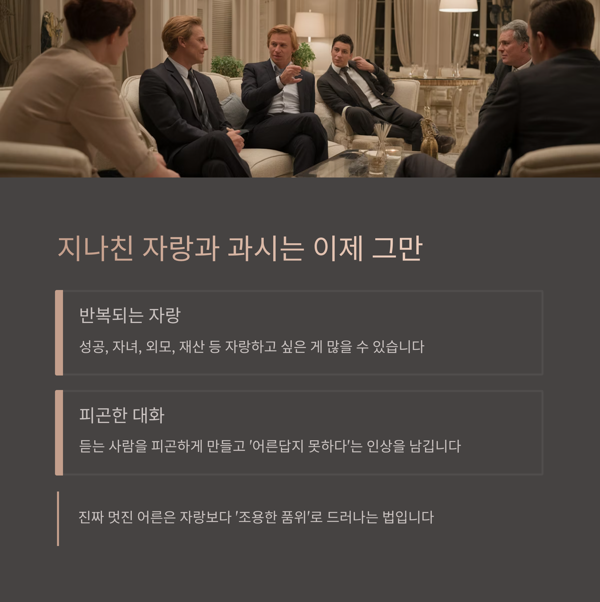 하지만 반복되는 자랑은 듣는 사람을 피곤하게 만들고, 결국 ‘어른답지 못하다’는 인상을 남깁니다.