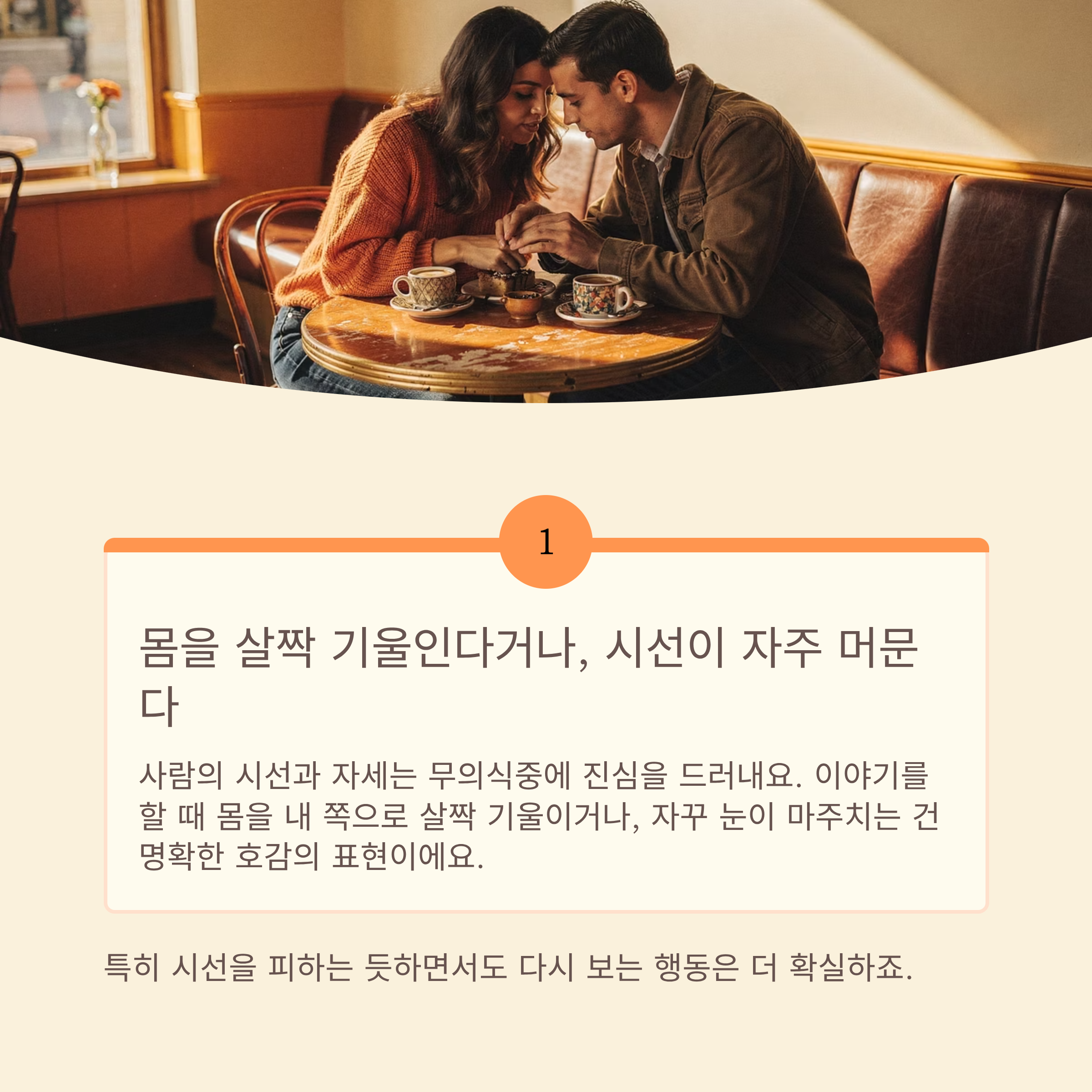 사람의 시선과 자세는 무의식중에 진심을 드러내요. 이야기를 할 때 몸을 내 쪽으로 살짝 기울이거나, 자꾸 눈이 마주치는 건 명확한 호감의 표현이에요. 특히 시선을 피하는 듯하면서도 다시 보는 행동은 더 확실하죠.