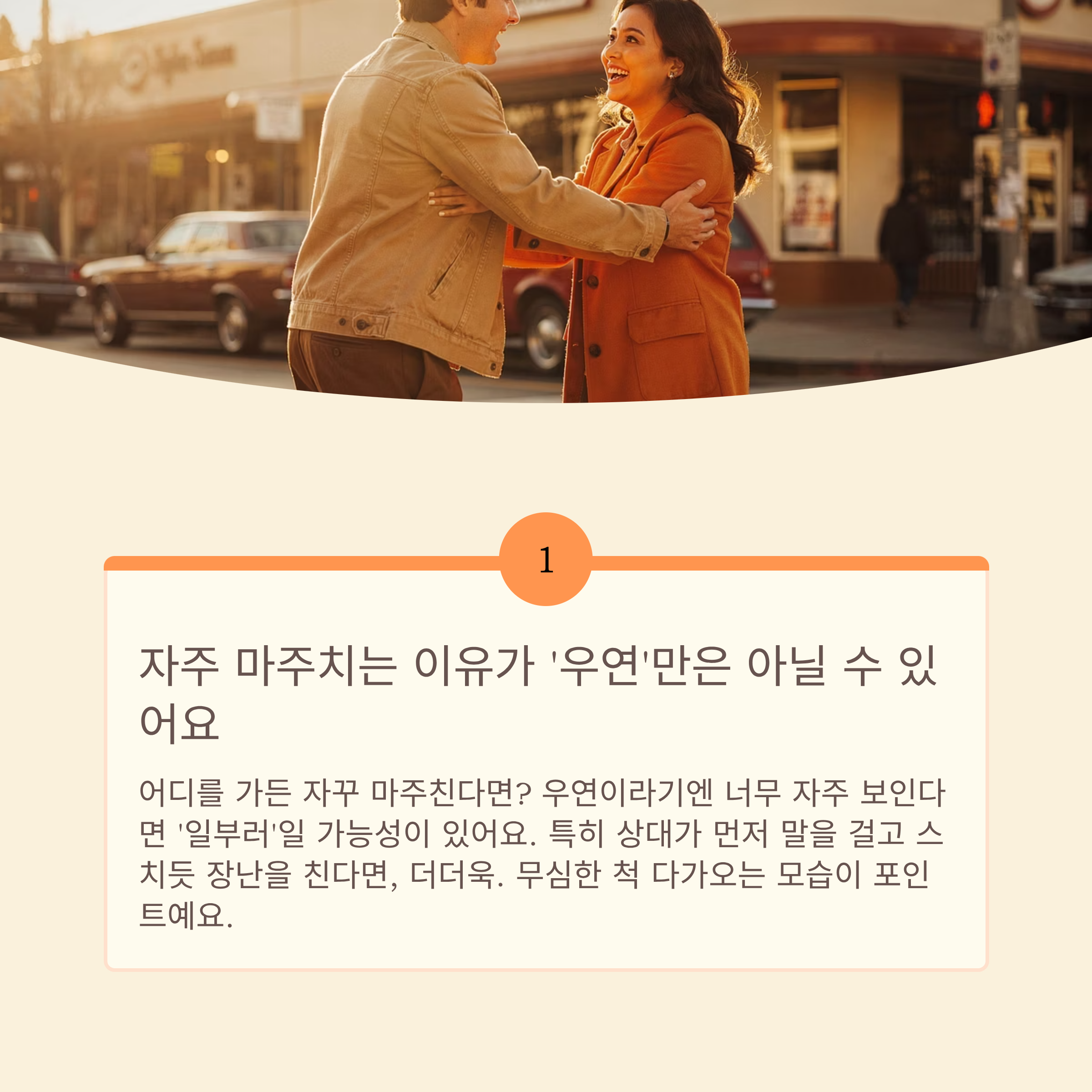 어디를 가든 자꾸 마주친다면? 우연이라기엔 너무 자주 보인다면 ‘일부러’일 가능성이 있어요. 특히 상대가 먼저 말을 걸고 스치듯 장난을 친다면, 더더욱. 무심한 척 다가오는 모습이 포인트예요.